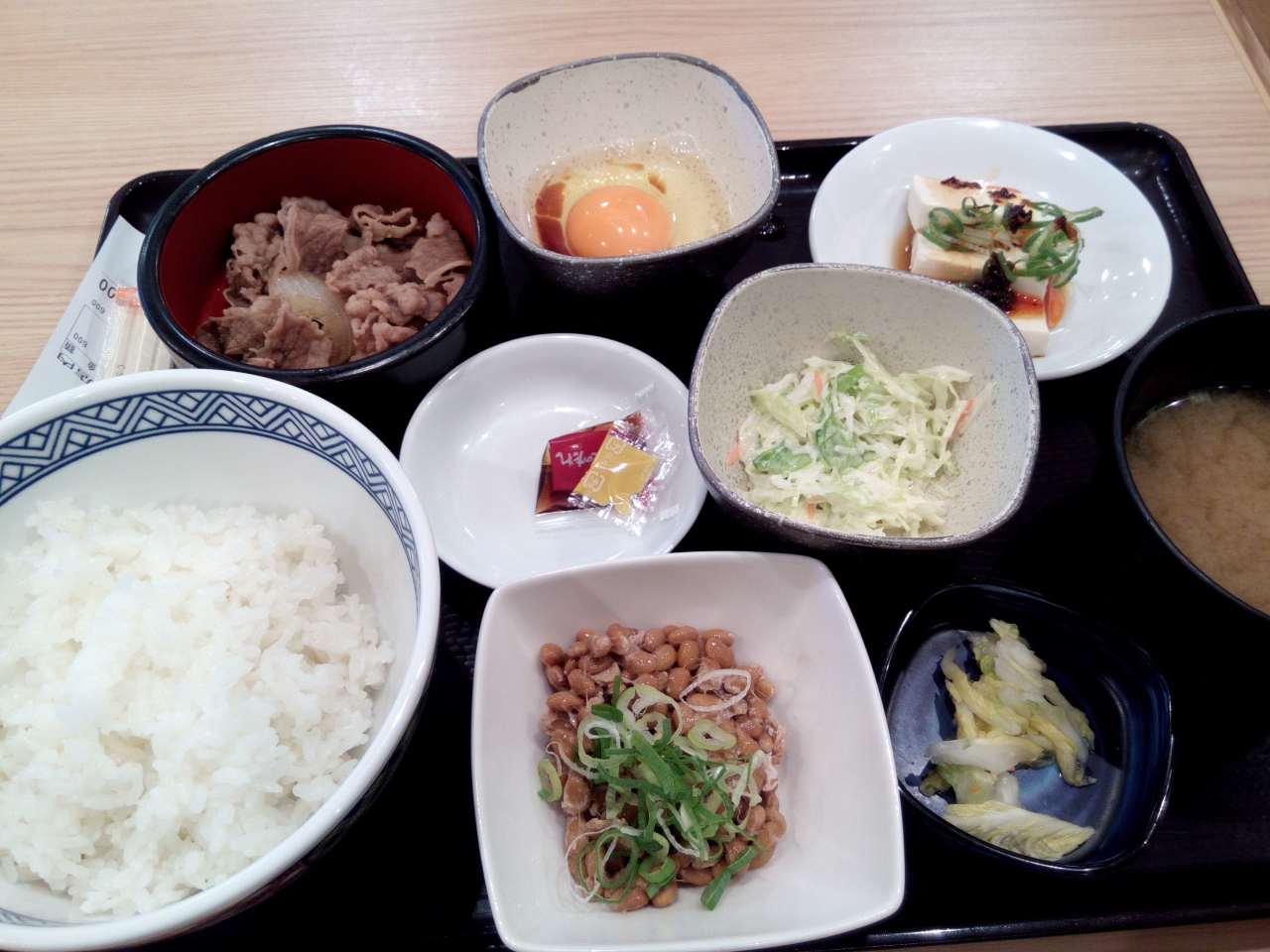 成田空港第二ターミナルビルの出国審査を終えて、搭乗口近くで朝食をしようと思ったら、吉野家しか空いてなかったので入店しました。朝から牛丼は重いな・・・と思ったら、納豆、卵がセットになった定食(600円)もありました。朝8時から開店していて、今後も朝早い飛行機に乗る時には、利用したいと思います。