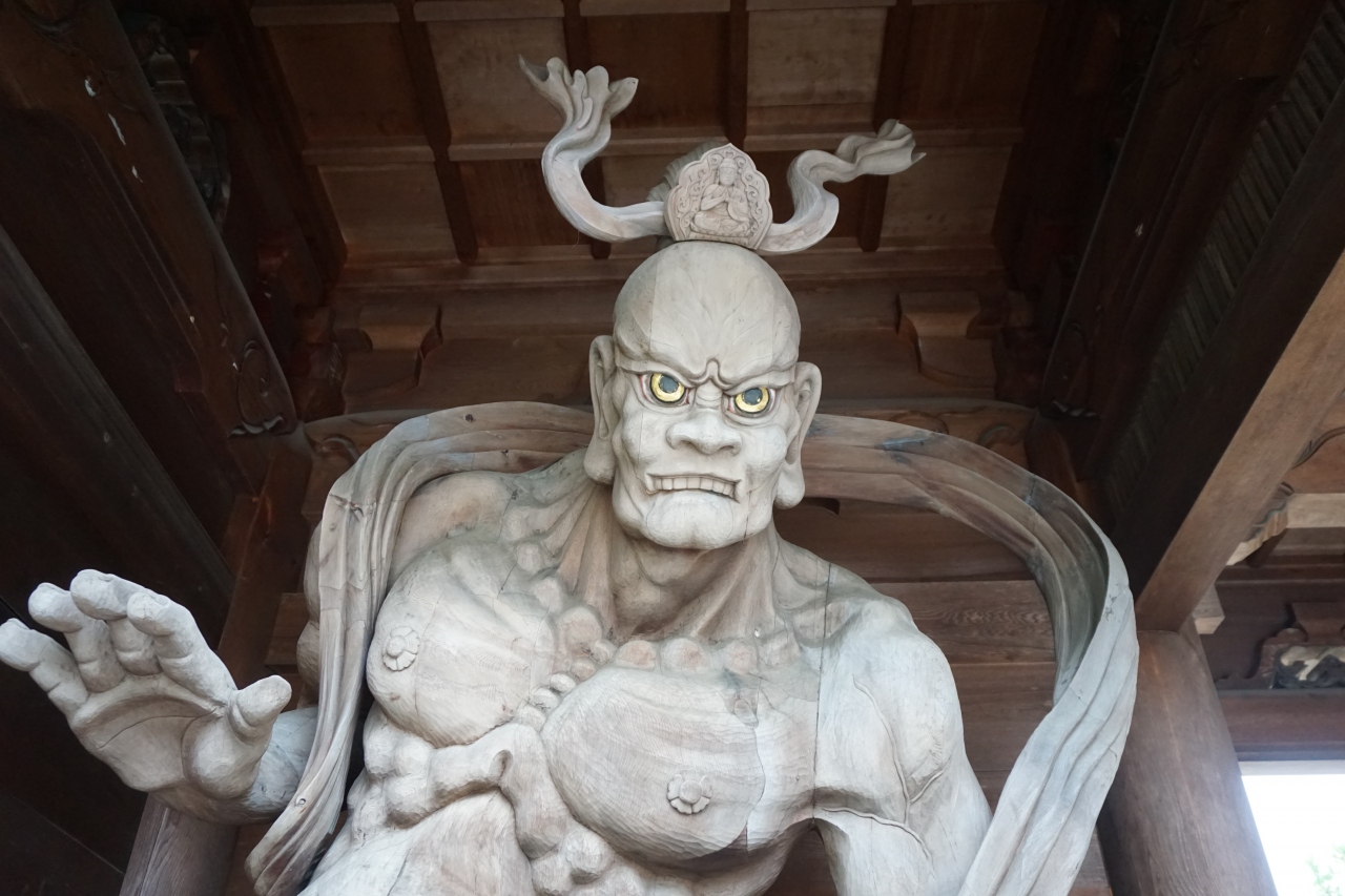 ここの見どころは、何んといっても山門の仁王像。無垢の木を彫り込んだだけのシンプルな象ですが、その形相は大きな目がギロリ。筋肉隆々の体躯とともに、けっこうな威圧感で迫ってきます。よく見ると目だけ彩色されている効果なんですね。いずれにしても、インパクトのある仁王像です。