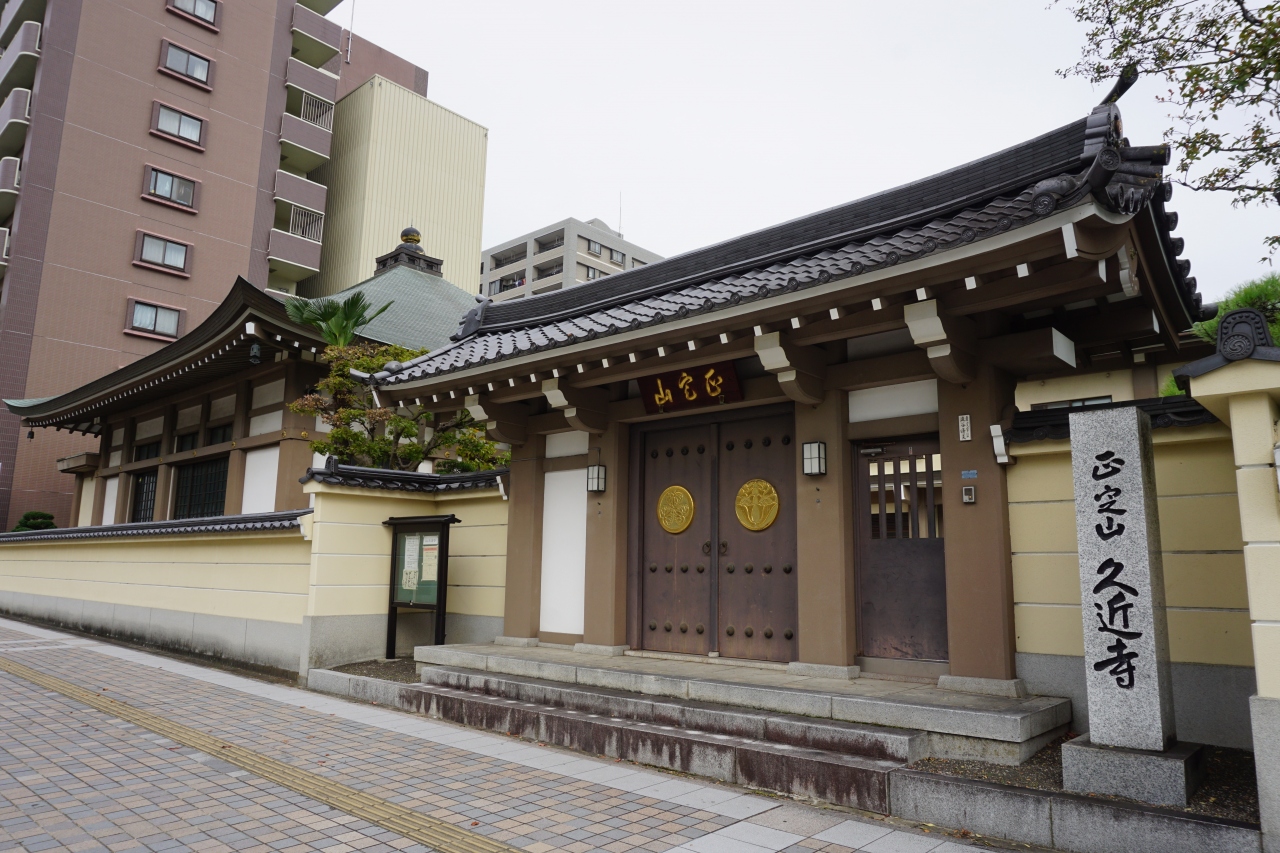 久近寺は、宮城野通りに面した浄土宗の寺。いかめしい山門と塀の後ろに方形屋根の本堂が見えていて、クリーム色の筋塀も整った佇まい。一方の境内は、緑がまあまあ。最低限の潤いは感じますが、都会のお寺的な限界はやはりあるかもしれません。