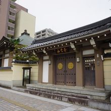 いかめしい山門と塀の後ろに方形屋根の本堂