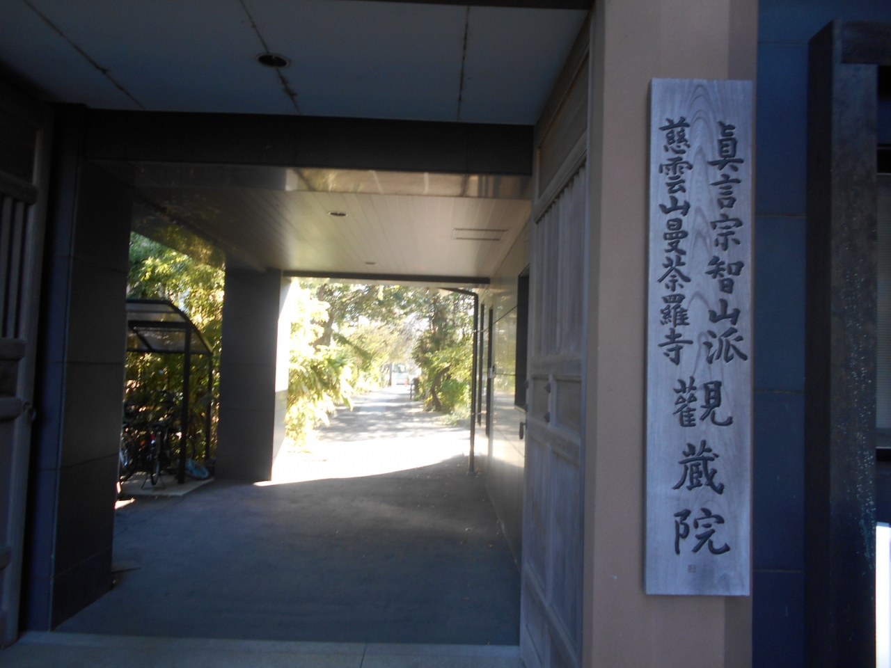 北側の入口には「真言宗智山派 慈雲山曼荼羅寺 観蔵院」という達筆の表札が掲げられている。
