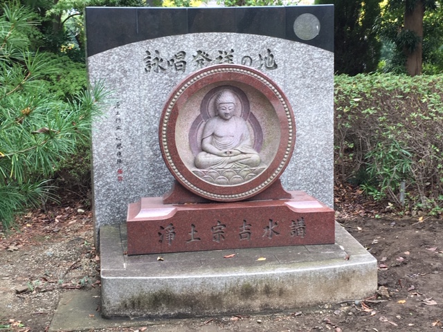 増上寺の赤い大きな三解脱門をくぐって境内の中に入り左の方へ行くと、水盤舎の後ろ辺りに石碑がいくつか集まって置かれている場所があります。そのうちの一つの石碑です。ただの石碑ではなく、何種類かの色が違う石を組み合わせてあり、真ん中に仏様が掘られていて、珍しい形だと思いました。魚供養之碑や仏足石などが近くにあります。詠唱とはちゃんと知りませんでしたが、この機に勉強になりました。