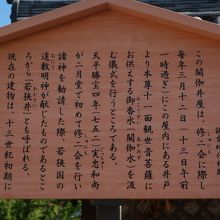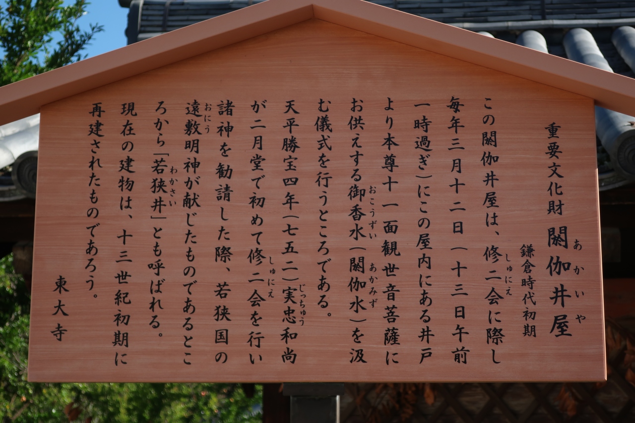 東大寺二月堂の前に閼伽井屋があります。名前の通り井戸を覆う建物で、閼伽井は3月に行われるお水取りの儀式が行われる井戸です。この閼伽井は若狭の国と繋がっており、この霊水を組んで御本尊に祀ることから、お水取りと言われる所以です。井戸自体は建物の中なので見学することは出来ません。また、建物も柵に紐が張られ近寄れません。