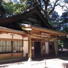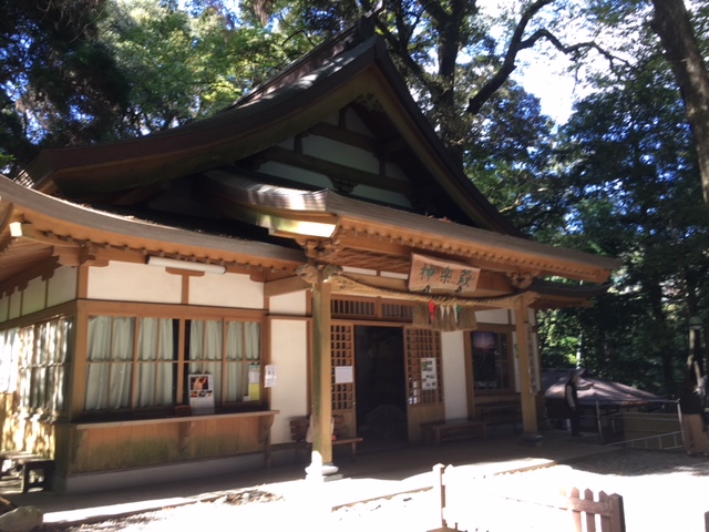大きな鳥居をくぐって境内に入ると周りは太い杉が何本もあり、かなり薄暗い感じでした。それが帰って神秘さを増している感じで良かったです。石段を登りきると本殿がある広い場所に出ますが、ここにも大きな杉の木が何本も有り、特に本殿の左側にあった夫婦杉がよかったです。本殿の右側にはこの神楽殿がありました。夜には夜神楽を見ることが出来るようですが、日帰り旅立ったので、見ることが出来ず残念でした。