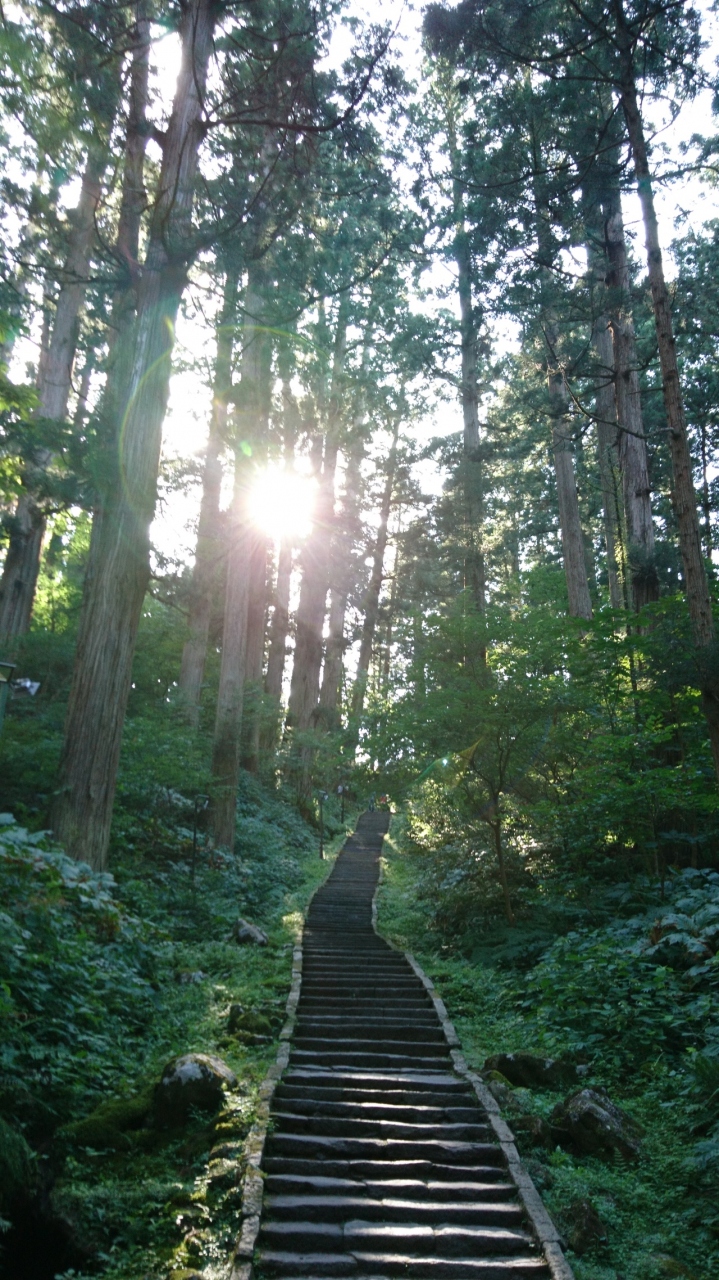 羽黒山は有料道路で上まで行くことができますが、元気の人は90分かけて
