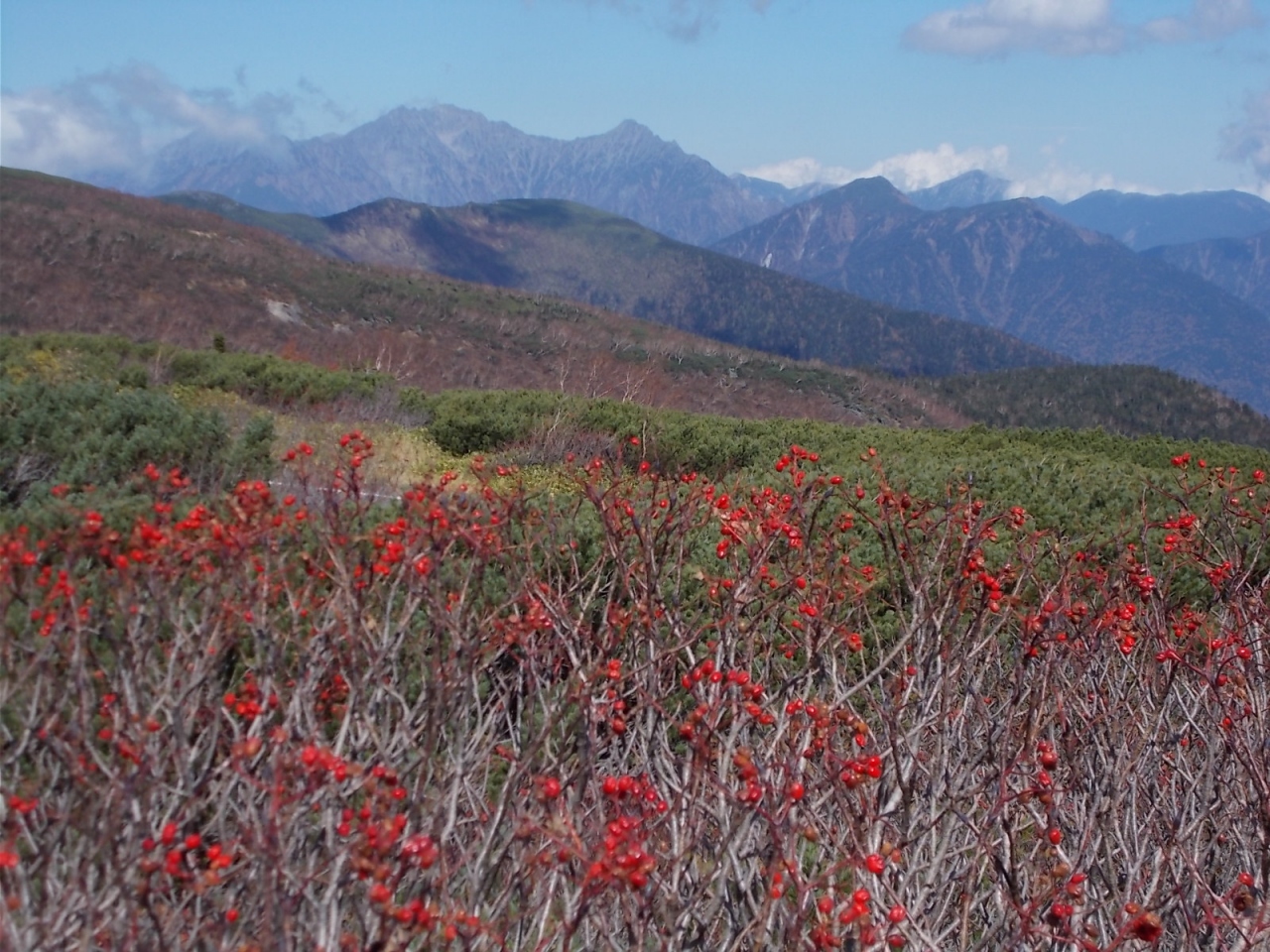 山岳紅葉の名所らしいのですが、10月9日時点では位ヶ原山荘から上はほとんど葉が落ちて紅葉は終わってしまっていました。10月はじめごろまでに行かないとだめみたいです。天気にめぐまれて遠くの奥穂高岳など北アルプスの山々がよく見えたのは良かったです。