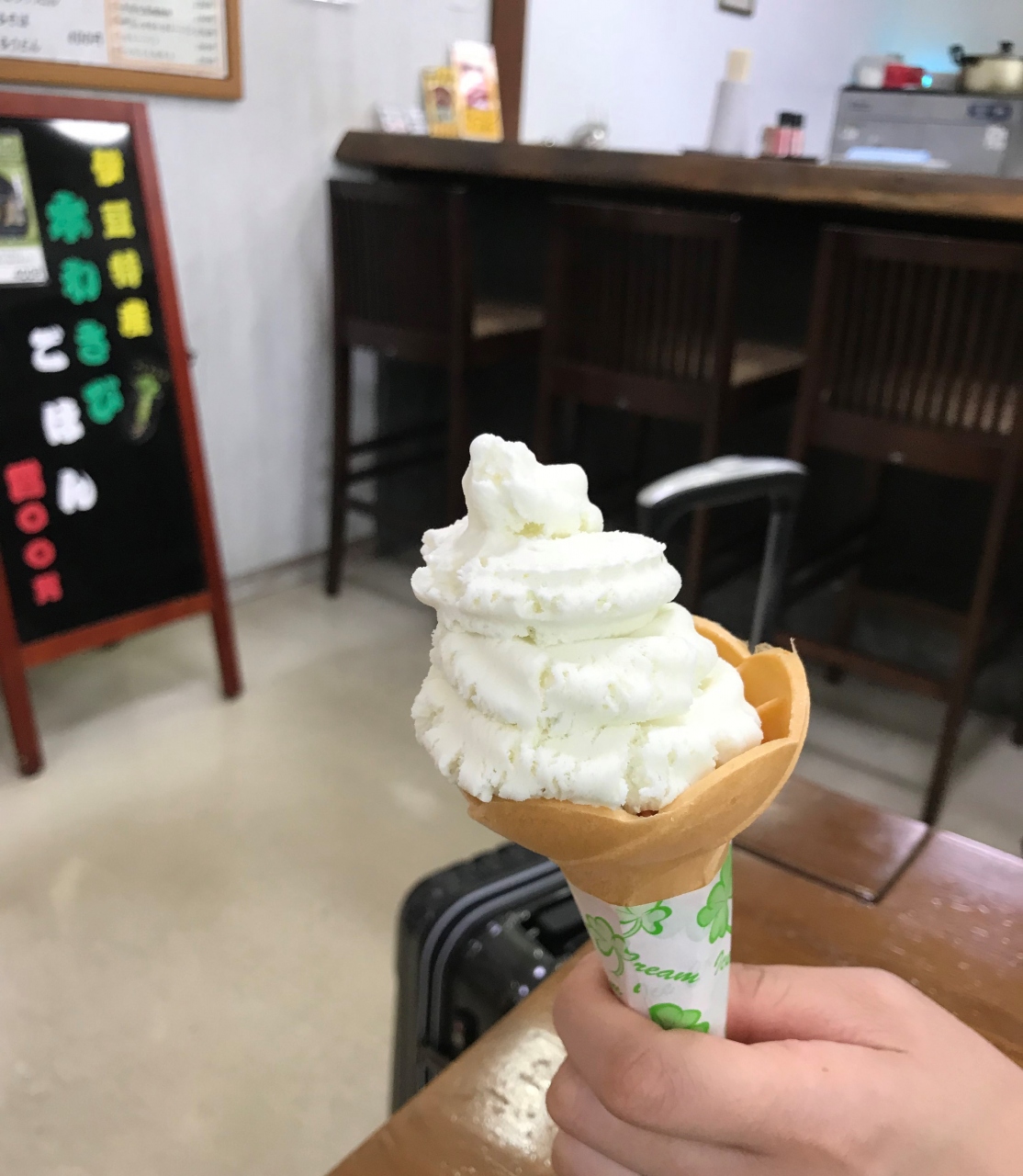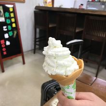 修善寺駅構内にあるお店で、売店の一角が軽食コーナーになっています。主なメニューは、蕎麦・うどんで、そのほかコロッケやソフトクリームが食べられます。蕎麦は地元特産の椎茸蕎麦が一押しのようでした。今回は、同じく地元の特産であるワサビソフトクリームをいただきました。