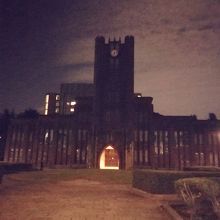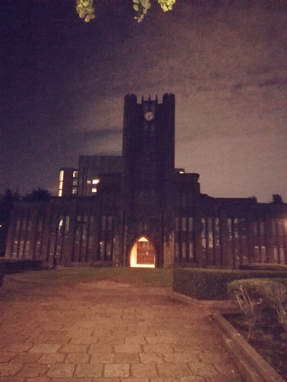 色々と歴史の舞台にもなった場所ですし、見るのを楽しみにしていたのですが、用事で到着したのが夕方18時過ぎでキャンパス全体が真っ暗で、地図を見なければここが安田講堂か分からないくらいでした。画像は明るさを調整しているのでうっすら建物が分かりますが、夕方以降に行くと本当に真っ暗です。東大のランドマーク的な建物なのだから、少しはライトアップでもしたらいいのにと思います。