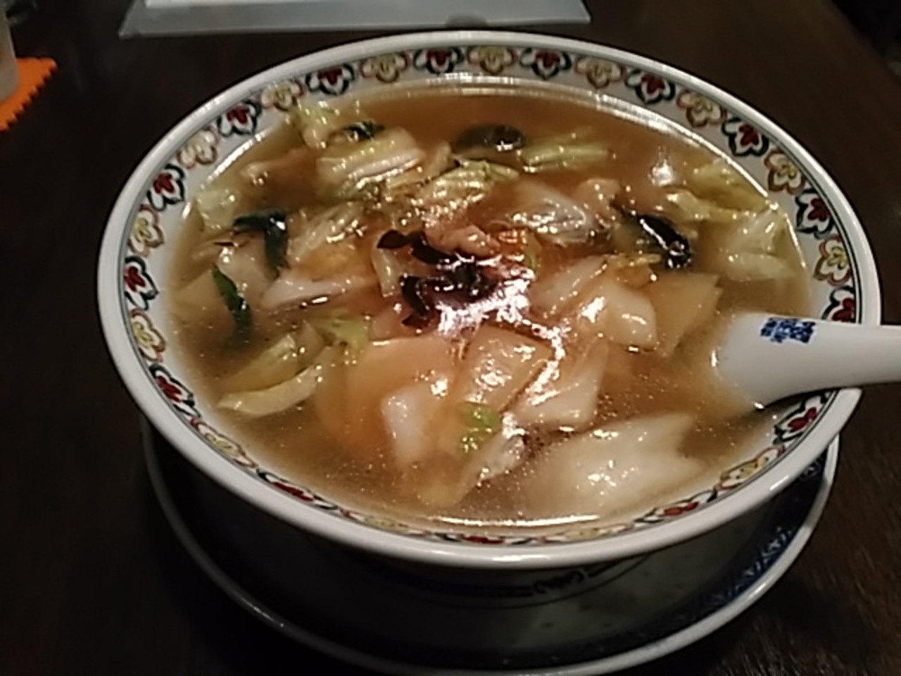 中華料理のお店です。行った日の本日のランチは四種類で広東麺、タンメン、中華飯,マーボ飯で全て600円です。今回は、広東麺にしました。おばちゃんが一人で作っていますが、出てくるまで早かったです。餡は緩めでしたが、味は調度良い感じでした。料理、中々の腕前だと思います。