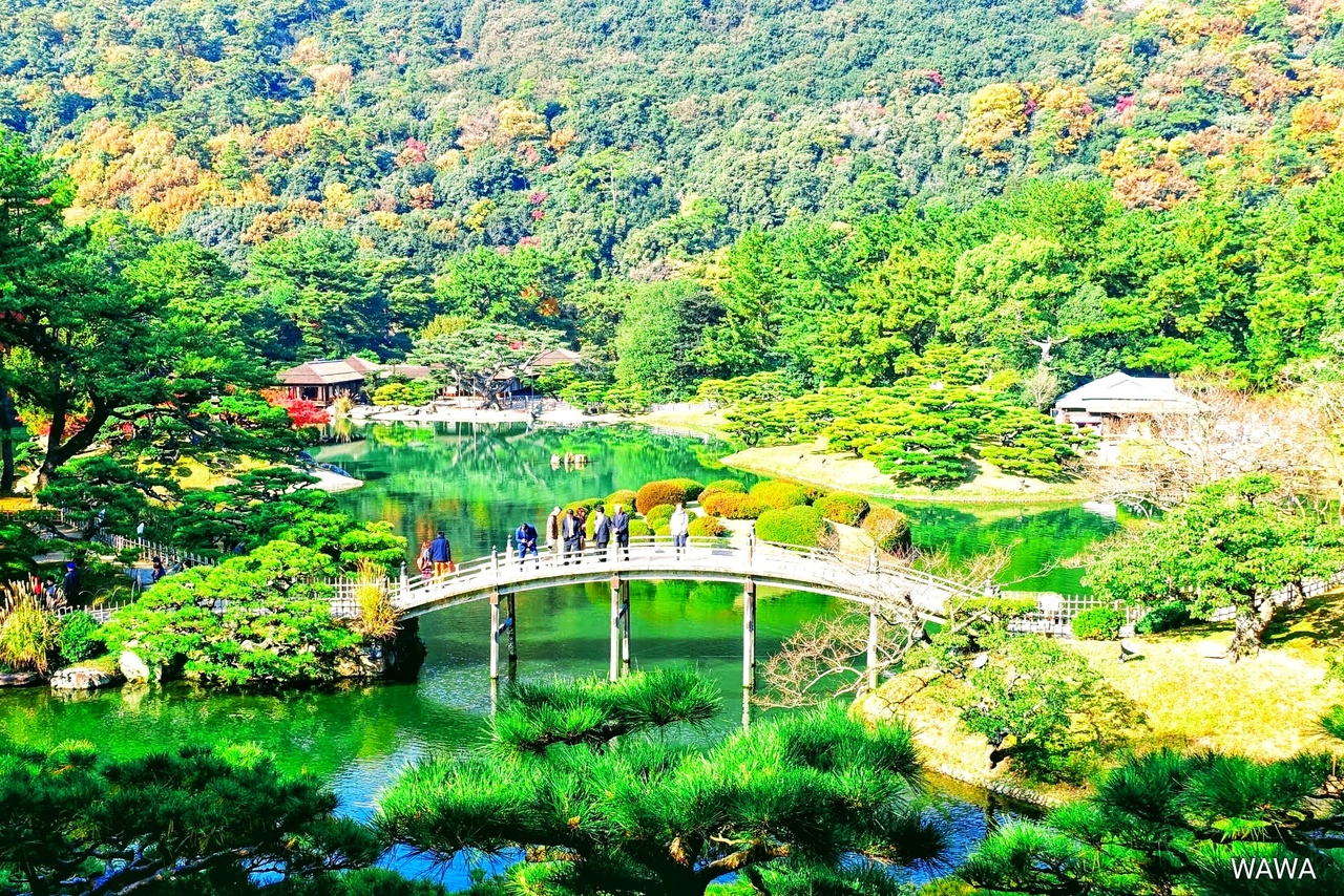 栗林公園(りつりんこうえん)の中でも飛来峰(ひらいほう)の頂上から望む、偃月橋(えんげつきょう)を中央に配した庭園の景色は、最も美しいものの一つとされています。