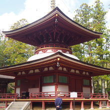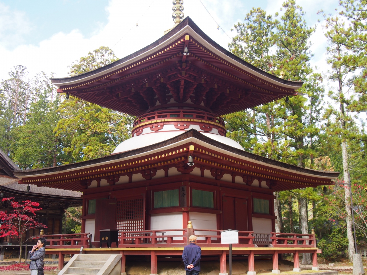 壇上伽藍の一番東側にある建物で、金剛峰寺側から歩いてくると最初に目にする建物です。同じ壇上伽藍の西塔と対をなすものです。1843年の火災で焼失していますが、弘法大師御入定1150年記念のひとつの案件として、1984年に再建されたものです。まだ新しさは感じられますが、ほかの壇上伽藍の建物と調和が取れています。