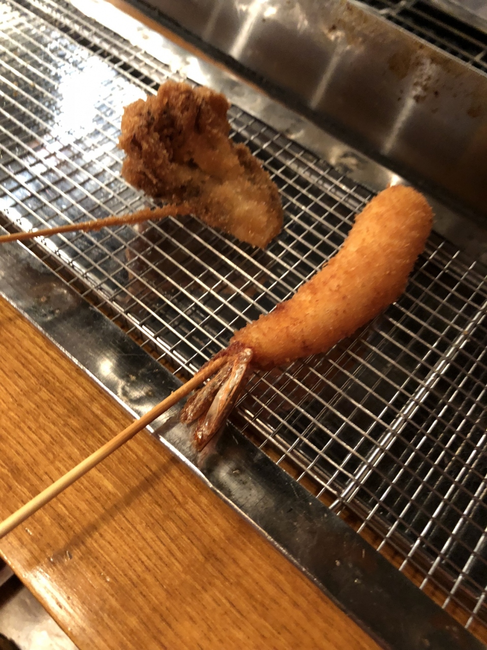 京都で一人飯。地下四条駅近くの串八を初めて訪問。一人でしたのでカウンター席の一番隅の席にしていただきました。メニューは串揚げと串焼きが中心です。串揚げを色々と注文しましたが、衣が薄くて食べやすいです。特に舞茸は香りが強くて歯ごたえもあり美味しく頂きました。とても良いお店でしたが、難点が一つ。