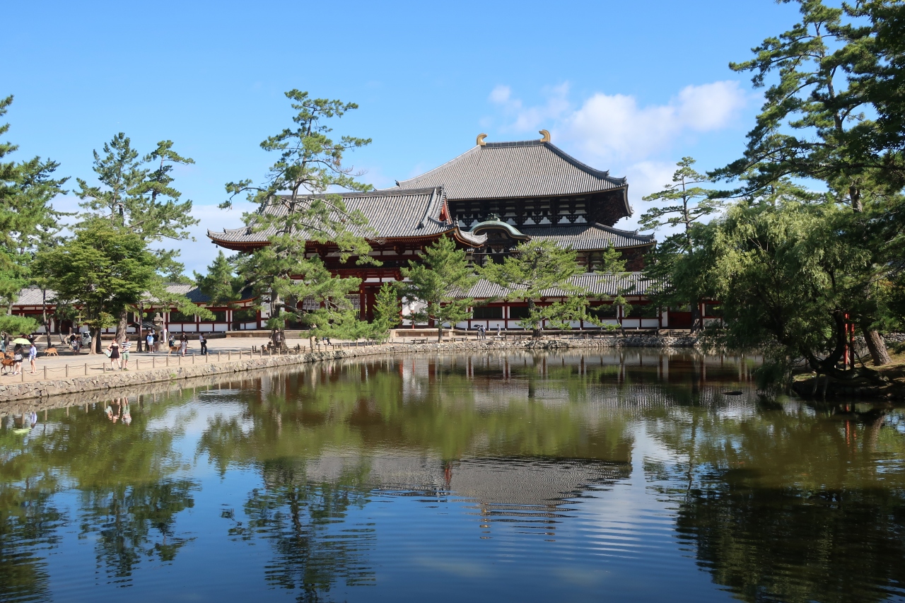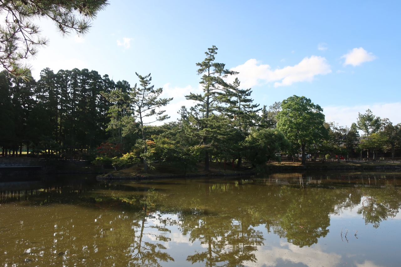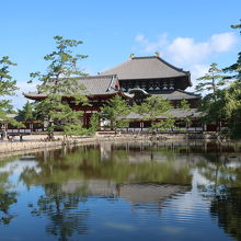 東大寺 大仏殿に向かう参道の右手にある大きな池が鏡池です。普通に鏡池を覗きこんでも緑色の水をした池ですが、鏡池の向こうに大仏殿が見える位置で見ると、名前の通り、鏡池に大仏殿が映り込んで正に鏡の様です。