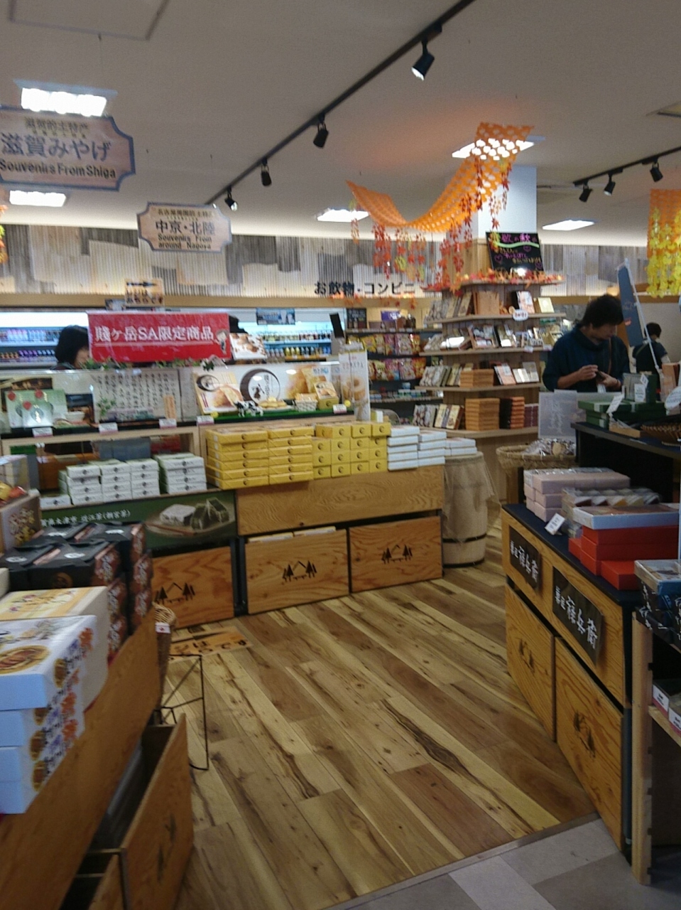 高速バスのトイレ休憩で、こちらのサービスエリアに寄りました。観光バスが他にもたくさん停まっていたので、ツアーなどでも利用が多いのかもしれません。トイレは行列ができていました。売店にお土産コーナーがあったので覗いてみましたが、名古屋・京都・大阪・滋賀など、色々な地域のお土産がたくさん並んでいました。