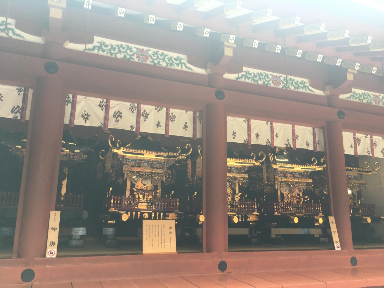 境内で鳩みくじ(初穂料200円)をひくと、おみくじと一緒にかわいい鳩のストラップが入っていました。一番奥の本殿まで進むと宝物殿の神輿などが目に入りましたが、入場するほどの時間がなく断念。次回はゆっくり,訪れたいですね。
