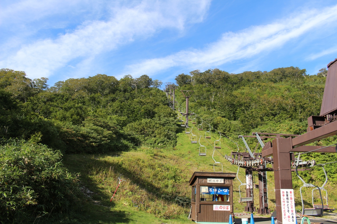 リフトに乗り高度をかせぐことができるので便利ですし、広い駐車場やトイレなど設備面でも充実しています。下からも月山が脇に小さく見えます。