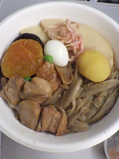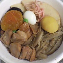 容器に炊き込みご飯を敷き詰め、その上に鶏肉・ささがき牛蒡・椎茸・筍・ウズラの卵・グリーンピース・紅しょうが・栗・杏等のおかずをトッピングしている。