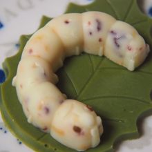 富岡製糸場で、絹の生産で飼育されていた蚕を模したチョコレート。