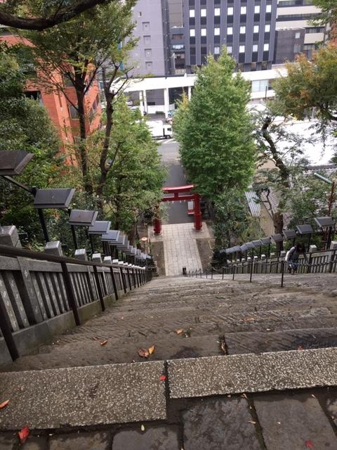 増上寺から愛宕神社まで歩いて行きました。出世の階段で有名な愛宕神社ですが、愛宕トンネルの近くにある愛宕山エレベーターに乗れば、この出世の階段を登らなくても愛宕神社に行くことができました。愛宕山エレベーターに乗っている時間は結構長く、かなり垂直距離があったので、この高さの階段はどんなものだろうと、愛宕神社側から出世の階段を見ると、目がくらみそうでした。こんな階段を馬で駆け上がったなど信じられません。それほどの急で長い階段です。