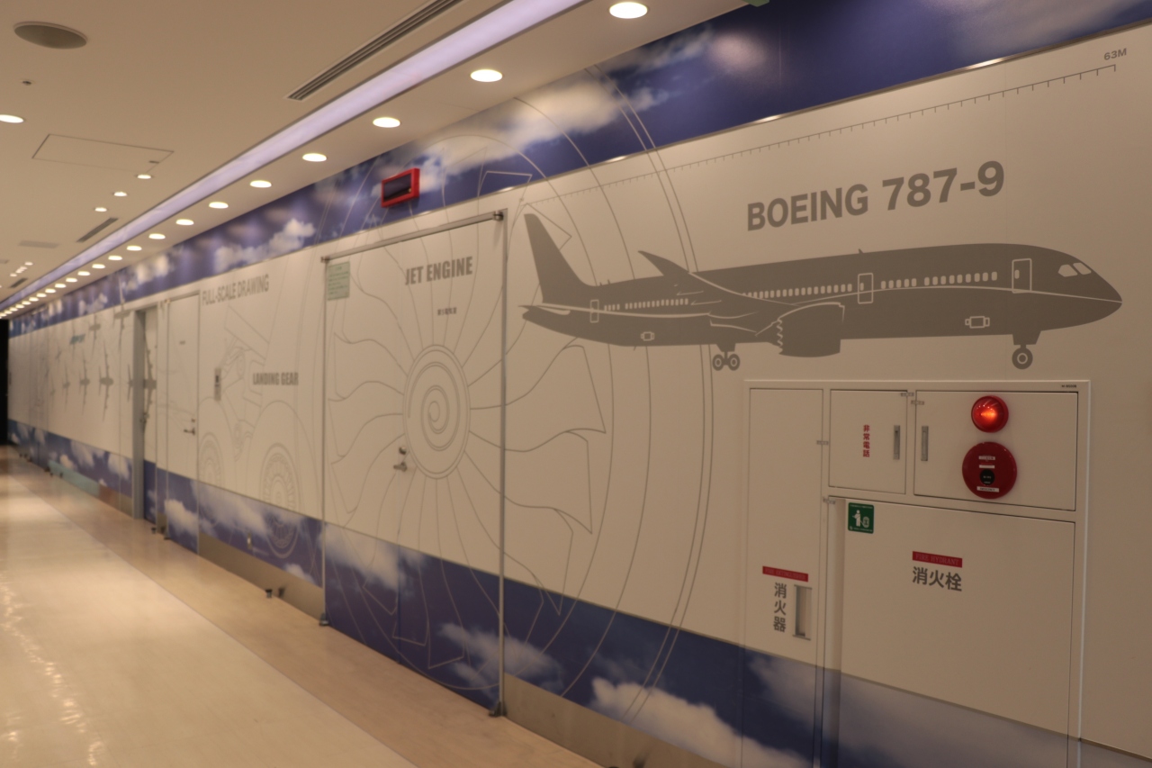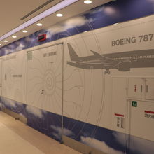 メインはショーウインドー越しにある機体模型で、羽田空港に定期便で就航している会社のものが全て並べられていますが、早朝深夜発着のものもあり、実際に生で見るのは難しい物もあります。壁にはB747やA380の機体が描かれている他、デッキ側には有料のフライトシュミレーターもあるので、飛行機好きにはお勧めです。