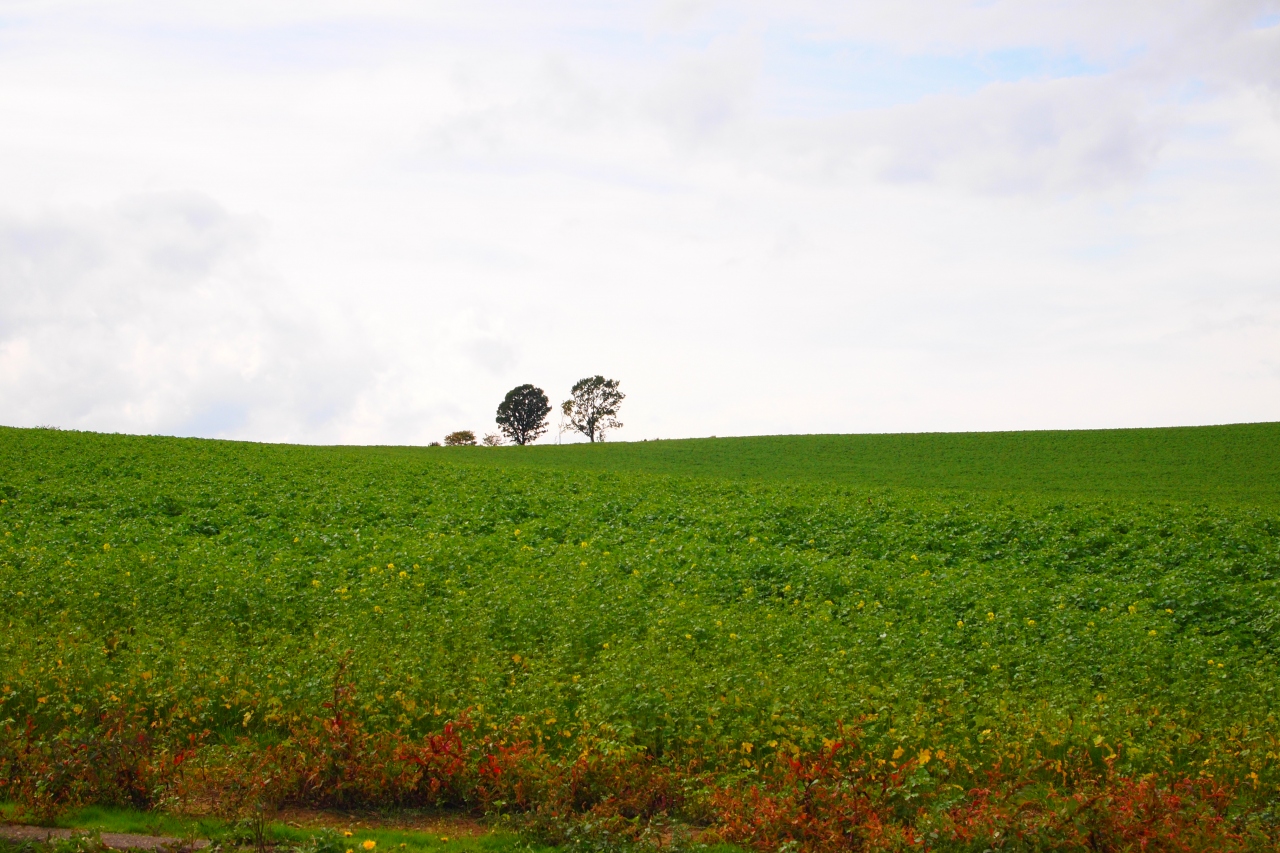 美瑛のパッチワークの中に現れる丸っこい木。よく見たら、木が3本ある?