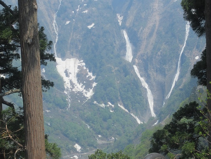 この時期に最も人気のある観光地に「立山黒部アルペンルート」があります。東は長野県の扇沢から入るルートと西は富山県の立山から入るルートがあります。全行程で素晴らしい大自然の絶景を見ることができますがこの行程でここ「称名滝」を見るためには立山側から入るのが近いです。立山から室堂へは立山高原バスを使用して行きますがその途中運転手さんはこの「称名滝」が見えるところで数分停車してくれて奥にその姿を見ることができます。サービス満点ですこの時期は凍っているのかしら?写真見てくださいね遠くにあるのですが良く撮れているでしょう。さぁこの先は絶景の景色、そして室堂にある「雪の大谷」です心ワクワクです。