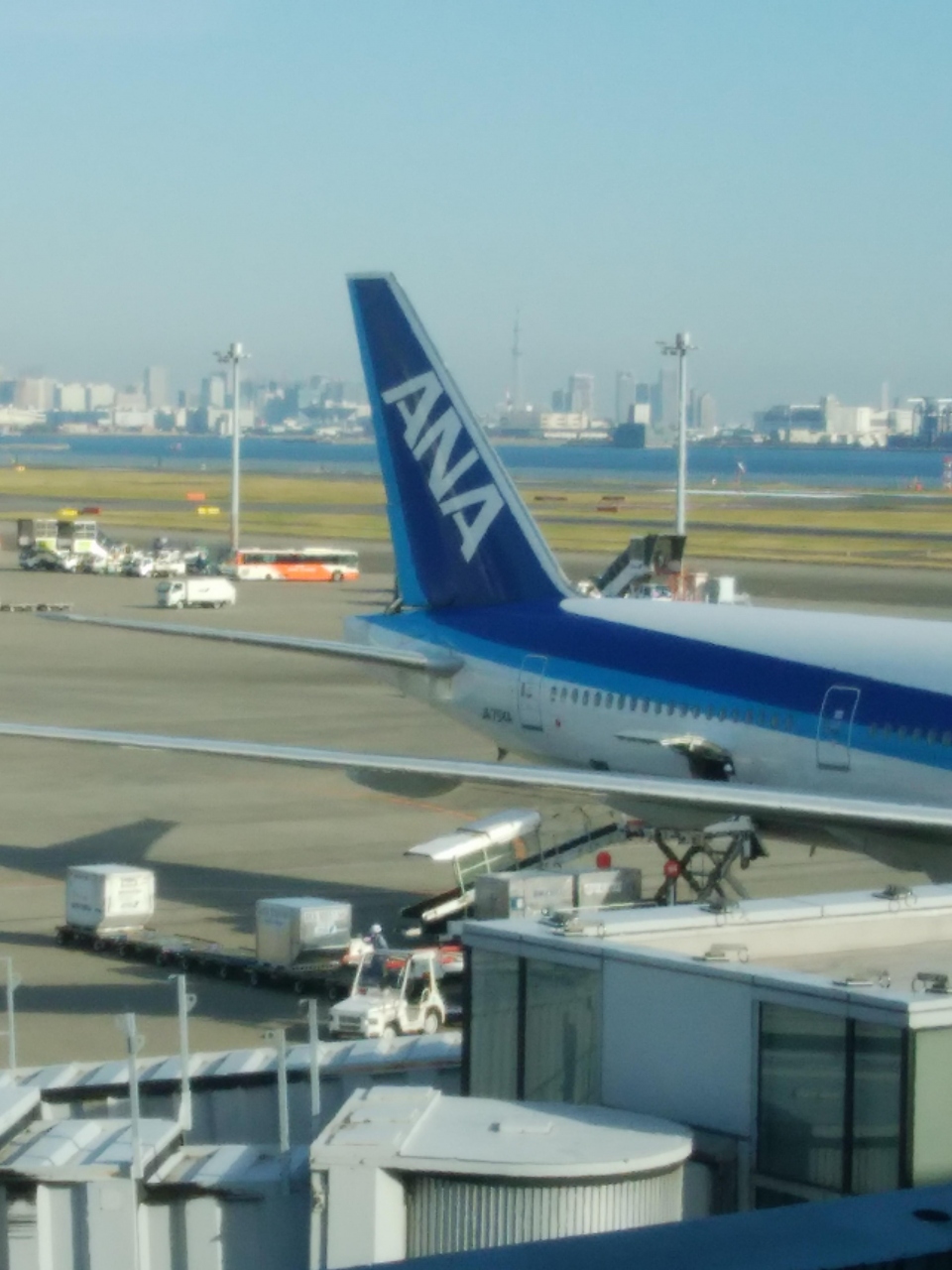 秋の連休の早朝、京急のエアポート急行先頭車を下車、エレベータで羽田空港第二旅客ターミナルビルへ直行しました。天井の高いビル内は広々としていますが、早朝から大勢のお客でカウンターは混雑しており、次回からはチェックイン機の利用が賢明かと思いました。