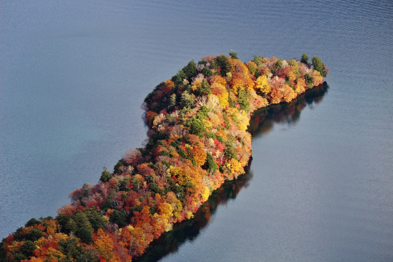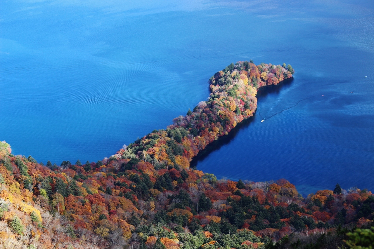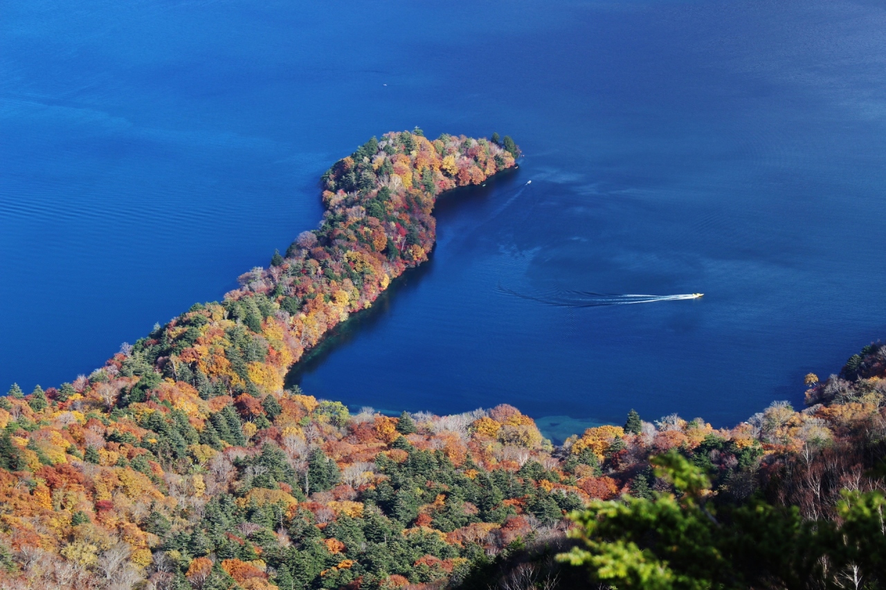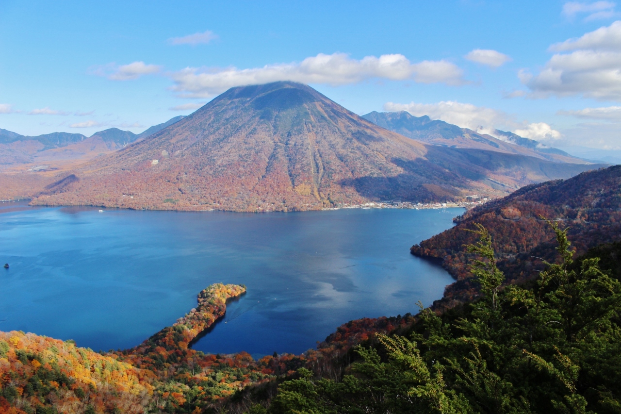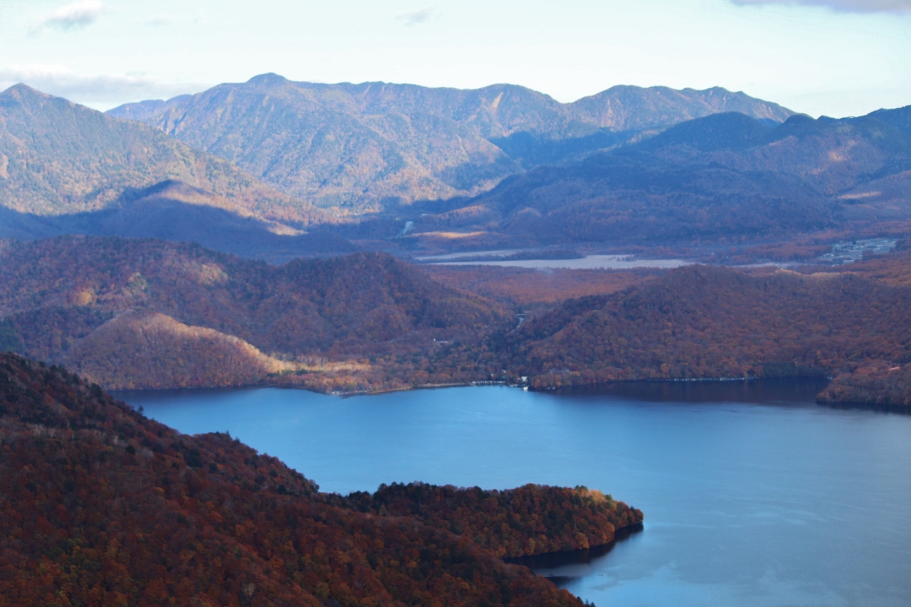 半月山道路の終点駐車場から10分ほど歩いたところに展望台があり、男体山と中禅寺湖、八丁出島を一望するパノラマの絶景が堪能できる。