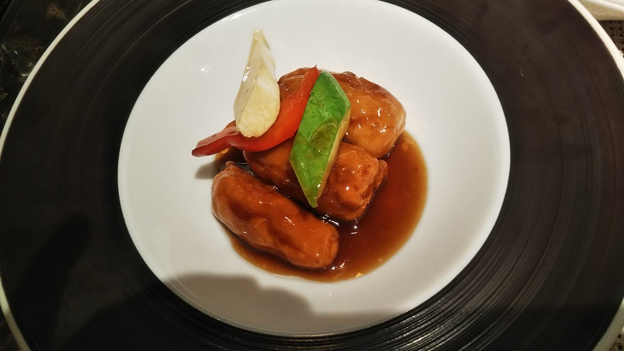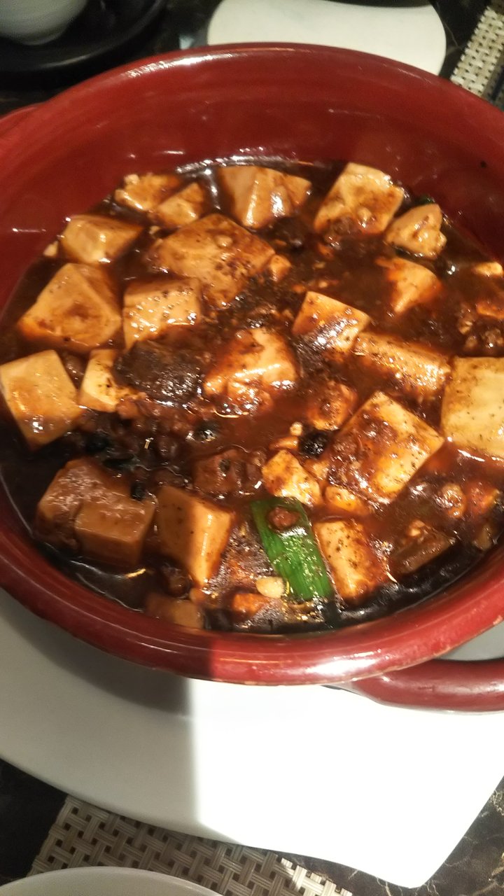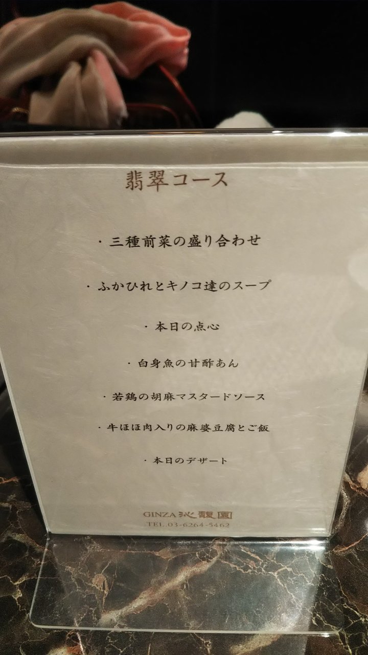 最初に前菜、ふかひれのスープ、海老餃子、白身魚の甘酢あん、若鶏の胡麻マスタードソース、牛ほほ肉の麻婆豆腐とご飯、デザートと中々の内容でした。