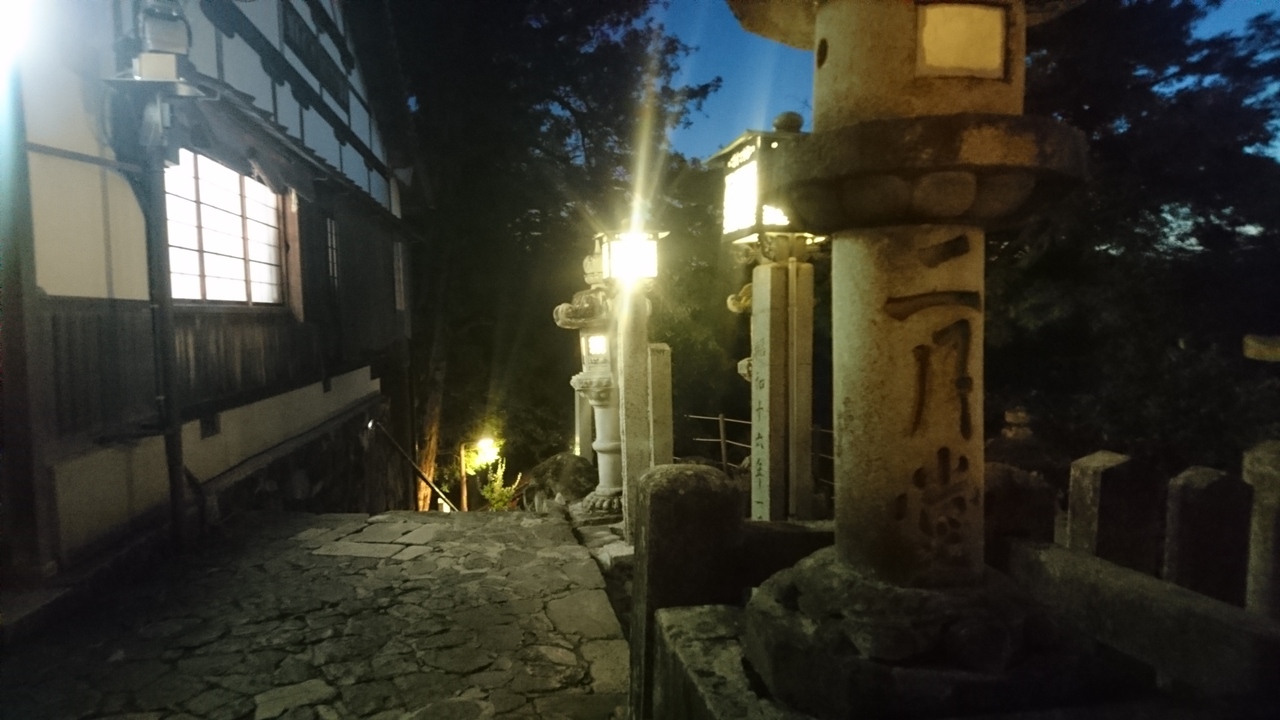 二月堂のライトアップはタクシーの運転手さんオススメとの事だった。ちょうど夕暮れ時ので空がとても幻想的。ライトアップも控えめで穴場。団体や子供もいなく20人くらいしかいなかった。帰りは徒歩で10分くらい階段と坂を下ると道路に出る。