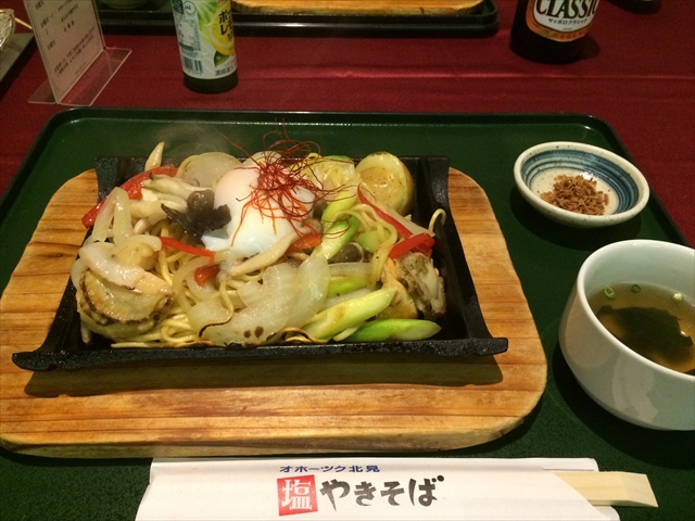 北見在住の友人に、塩焼きそばの人気店・有名店を教えてって連絡したら、ホテル黒部のレストランを教えてくれました。お店の雰囲気はちょっとリッチな感じで焼きそばのみでもいいのかな?と思いましたが、メニューを開いて最初に塩焼きそばが載っているので、レストラン側も塩焼きそばを推してるのでしょう。熱々の鉄板で供されテーブルでスープ(?)を掛けてくれて完成です。ホタテも野菜も美味しくて、ジャガイモもホクホクでとても美味しかったです。是非また食べたいと思いました。お値段は¥1080でした。