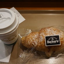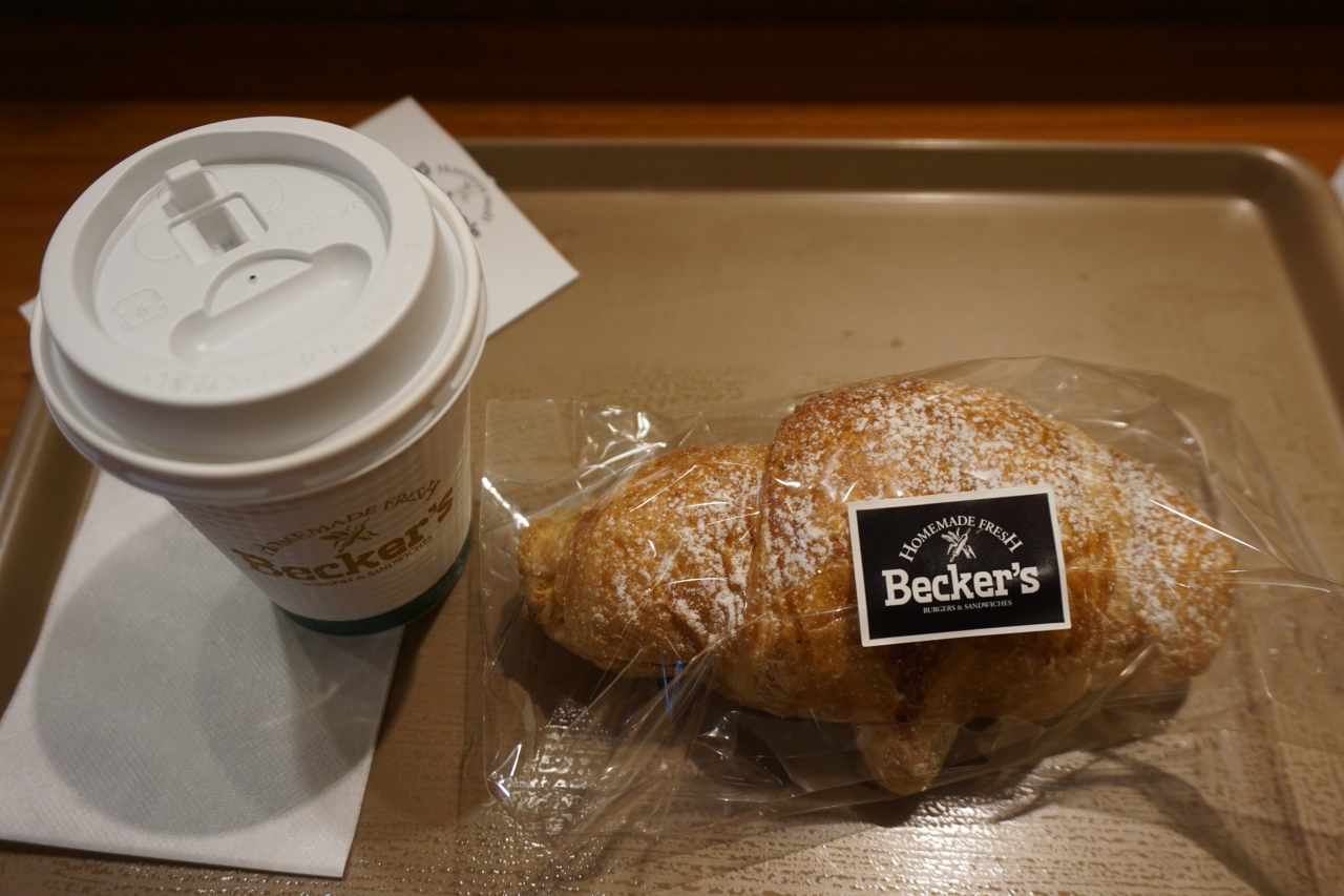 ベックスコーヒーショップは、駅の構内でよく見かけるお店。朝早くからやっていて、290円のモーニングがあったので、それにしてみました。抹茶クリームのクロワッサンとコーヒーのシンプルなセット。初めて利用しましたが、このコーヒーの苦みは目が覚めるような感じです。