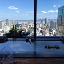 阪急グランドビルの高層階にあるので、カウンター席から鉄板越しに景色が見渡せるようになっています。景色を楽しみながら、目の前で鉄板調理をしてくれます。