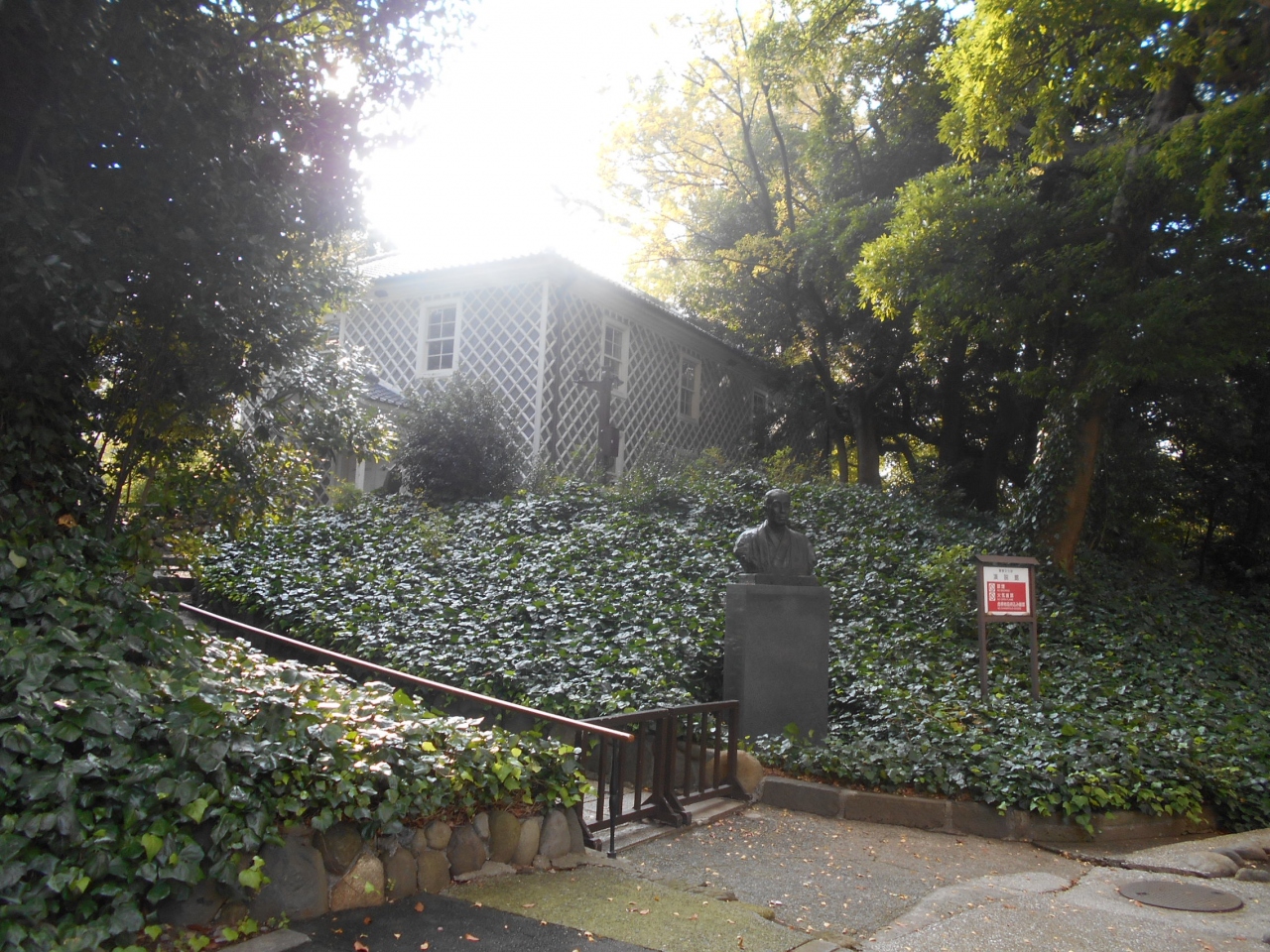 三田の山の南側、現在は慶應義塾大学の正門のすぐ上に建つ和洋折衷のナマコ壁の建物で、昔は周囲にも入れたが、近年は防火上の配慮か、遠望するだけ。