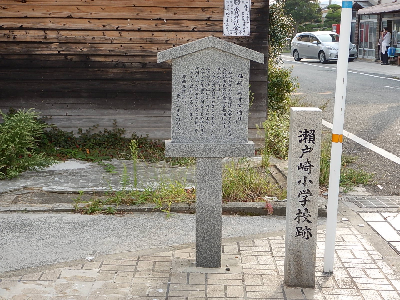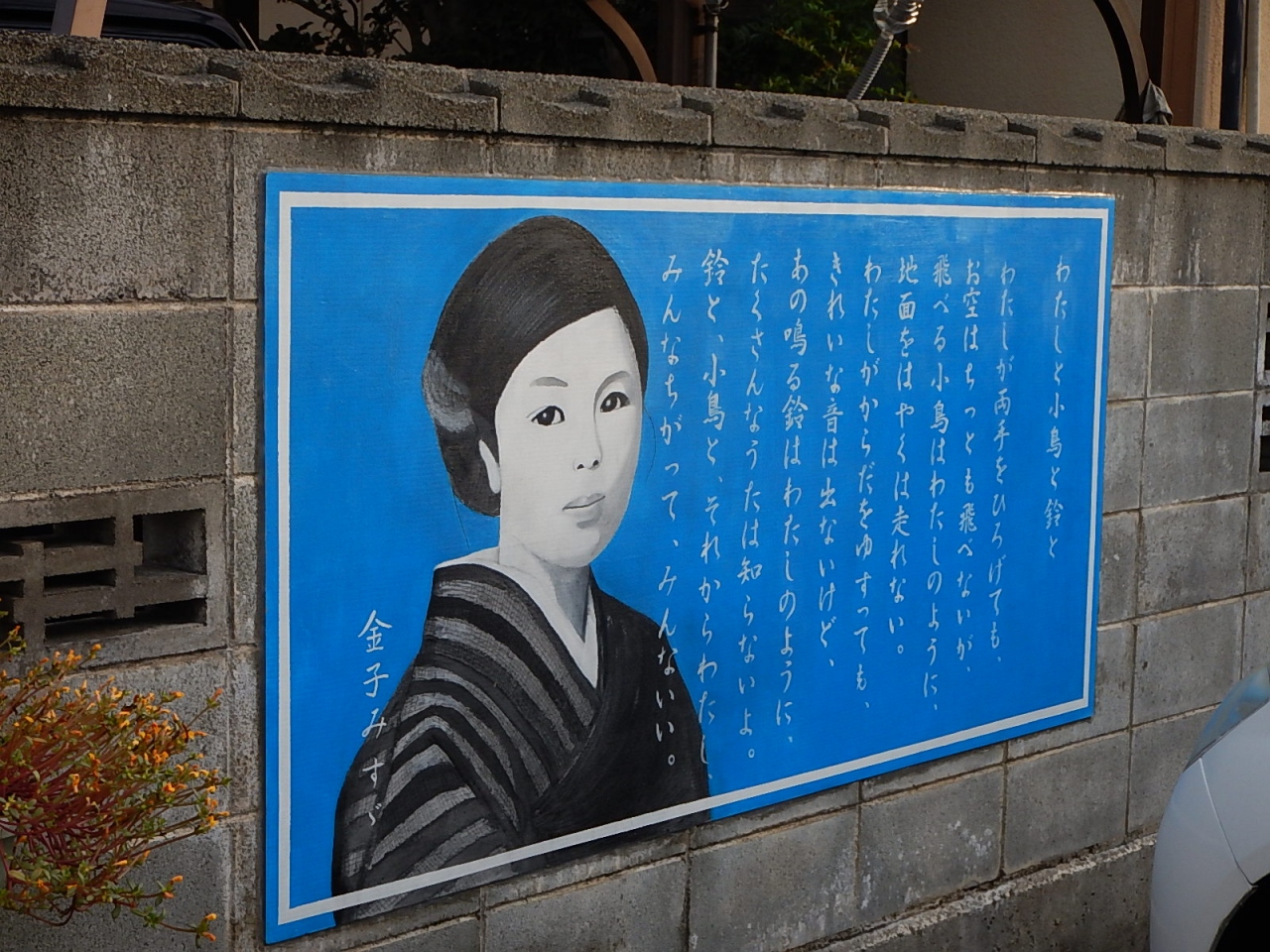 仙崎駅から記念館まで続く商店街。シャッターや軒先に金子みすゞの詩がかかげられている。店舗だけでなく一般の家も小さな板に詩を書いて出しているのが面白い。