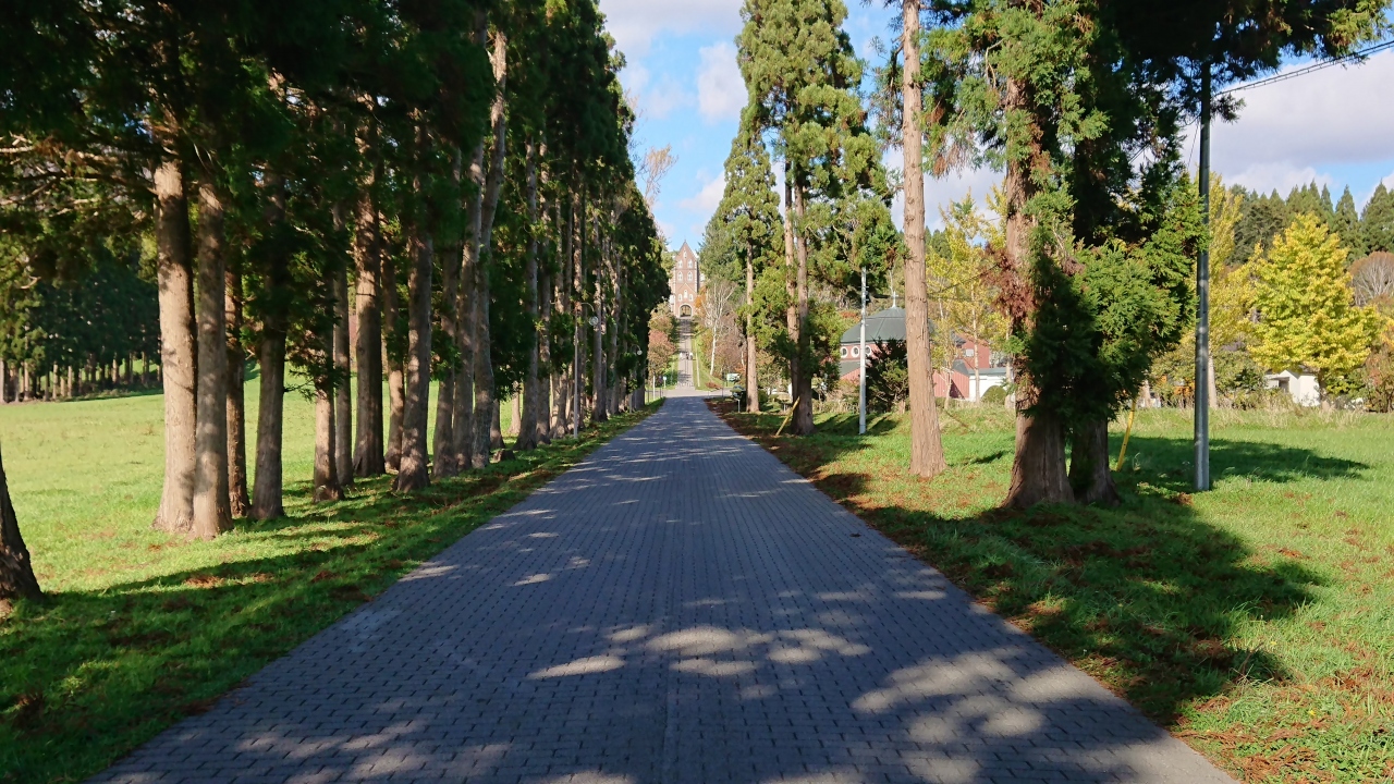 函館からレンタカーで行きました。細い路地を抜けていくと、その先に現れたのはポプラ並木とその間に見える赤レンガの教会。牧草地もあり、絵になる風景です。坂の手前の駐車場に車をとめ、中央の階段を歩いて登ってみました。