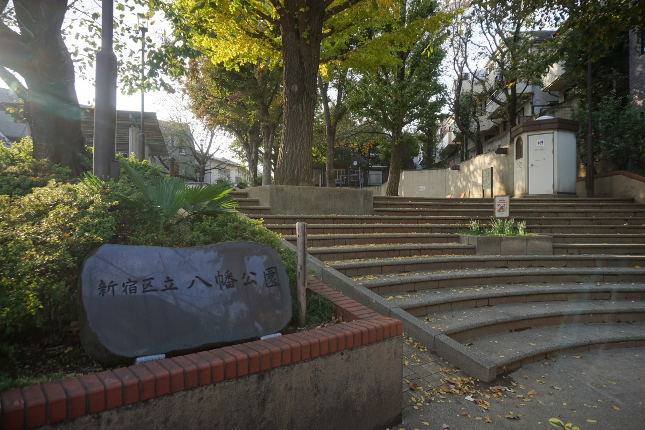 八幡公園は、落合中央公園の南西。八幡通りに面した小さな児童公園です。八幡通りからは石段を少し上がった一段高い場所。銀杏やけやきがちょろっとあって、紅葉が始まっていました。子供たちが数人遊んでいましたが、まあそれ以上のものではありません。