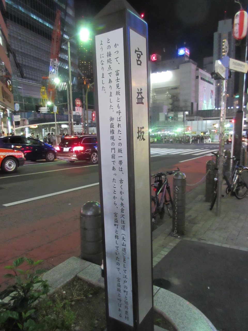 渋谷にある道玄坂と並んで有名な坂。渋谷駅を挟んで道玄坂とは反対側、青山方面へ向かう坂道です。車も人も絶えず通っていますが、ちゃんと説明板のようなものはありました。かつては「富士見坂」と呼ばれていたとか。ということは、坂上からは、やはり富士山が見えていたのでしょう。