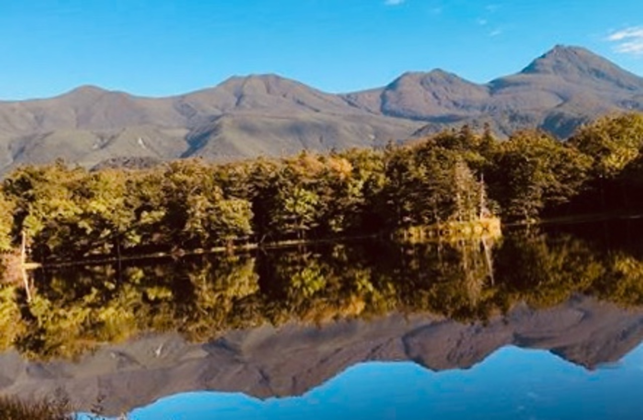 知床半島にある、知床五湖に行きました。水面にうつる山々の景色と紅葉で茶色くなった木などが幻想的です。