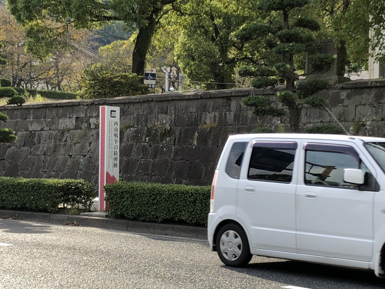 国道10号線城山入口交差点付近の石垣に残る西南戦争の銃弾跡です。この場所はもともと西郷が造った私学校でした。今は史跡として石垣だけを残しています。その石垣に西郷を追い詰める政府軍の激しい攻撃の後が残っているのは感動ものでした。