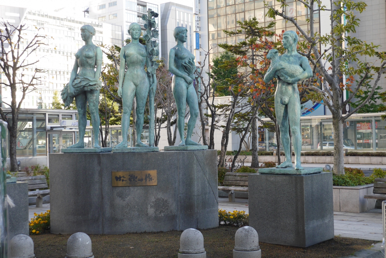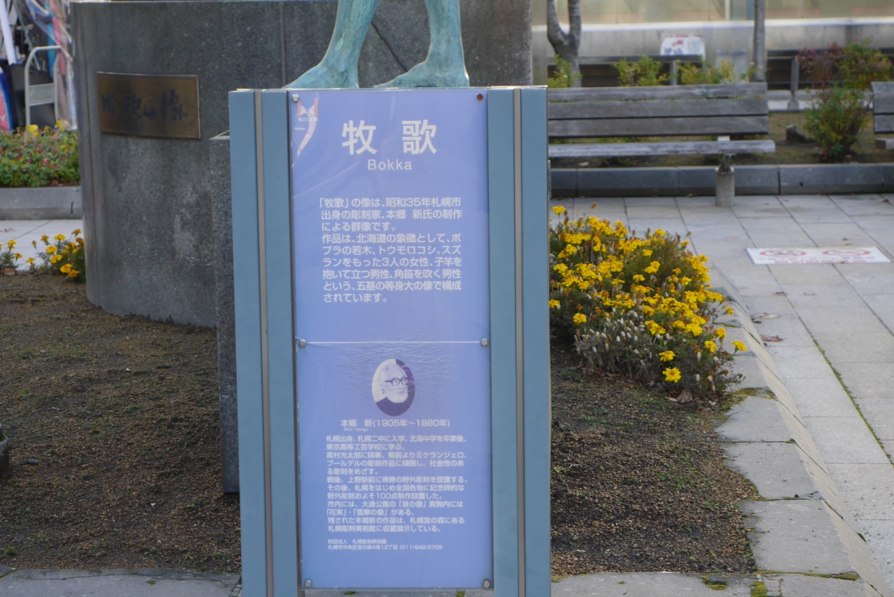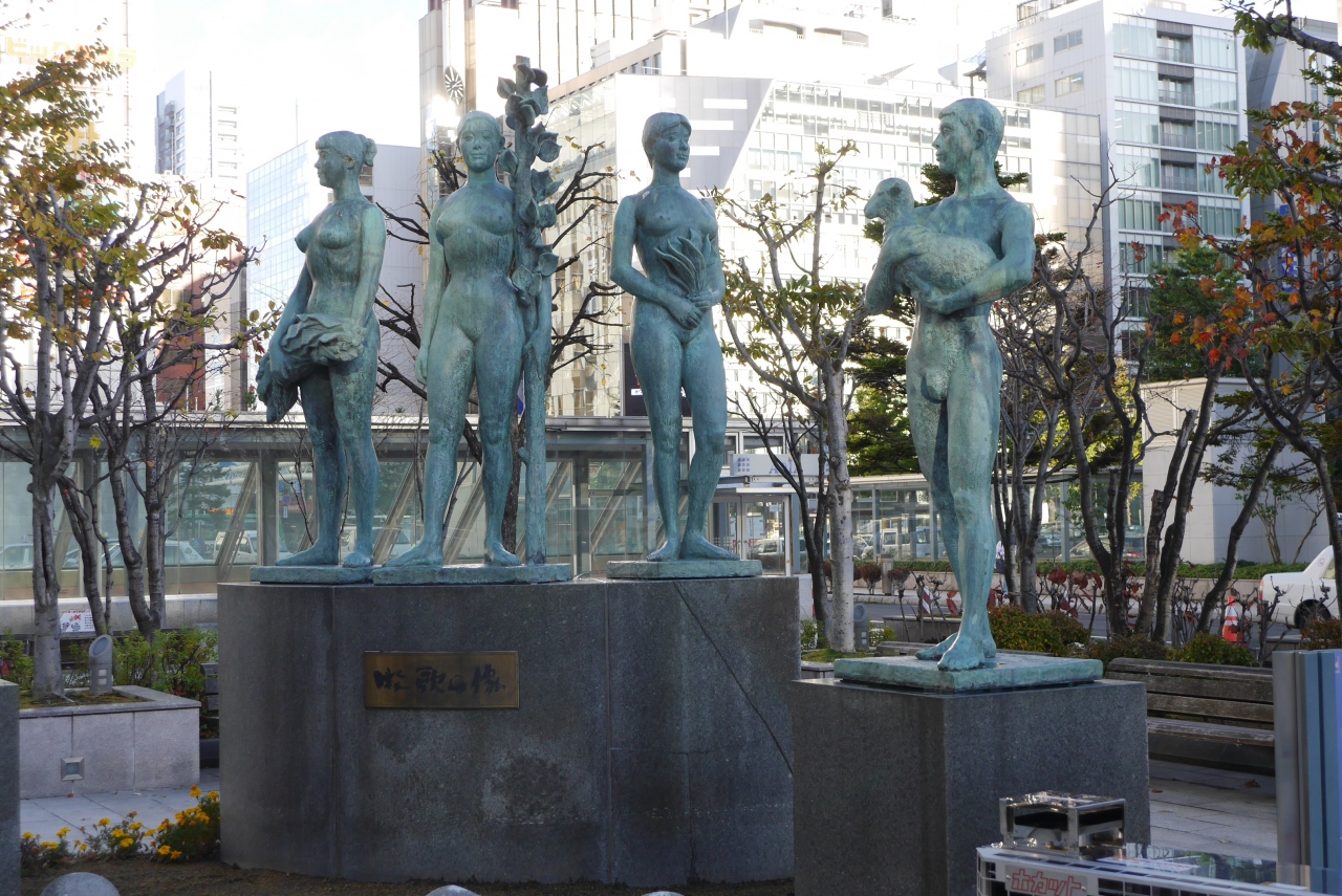 札幌駅南口にあるブロンズ像です。大通公園を初め、市内各所に様々な像が置かれている札幌ですが、駅前にも立派な像が置かれていました。牧歌の像と名が付き、ポプラの若木、スズラン、トウモロコシを持った3人の女性と子羊を抱く男性、角笛を吹く男性の等身大の5人の群像です。像の後ろにはベンチが置かれ、ちょっとした待合所にもなっています。