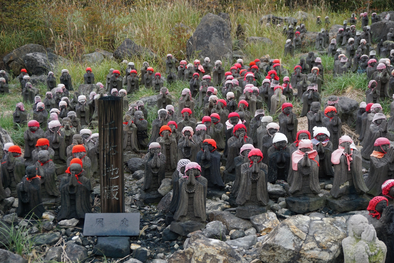 殺生石に続く賽の河原にある千体地蔵尊。遊歩道の脇にぎっしりと並んでいます。それぞれ赤い帽子を被っていてかわいらしい姿ですが、よく見るとむしろ特徴は合掌した手の大きさ。体の大きさに比較するとかなりでかい。願いを込めた思いの強さを表しているのかもしれません。