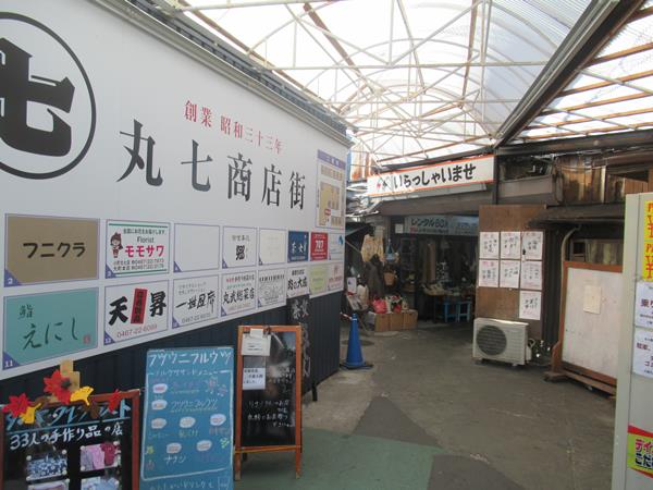 JR鎌倉駅から海の方向に向かって東急ストアの前を通るとすぐに右手に現れるのがなんとも怪しげないい雰囲気を醸し出している丸七商店街。駅から2~3分の近いところにあります。
