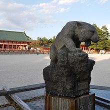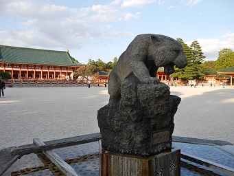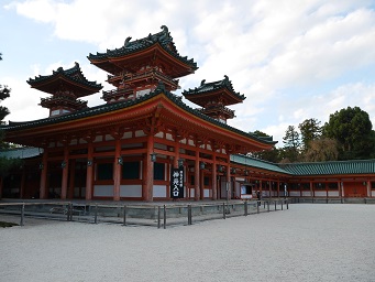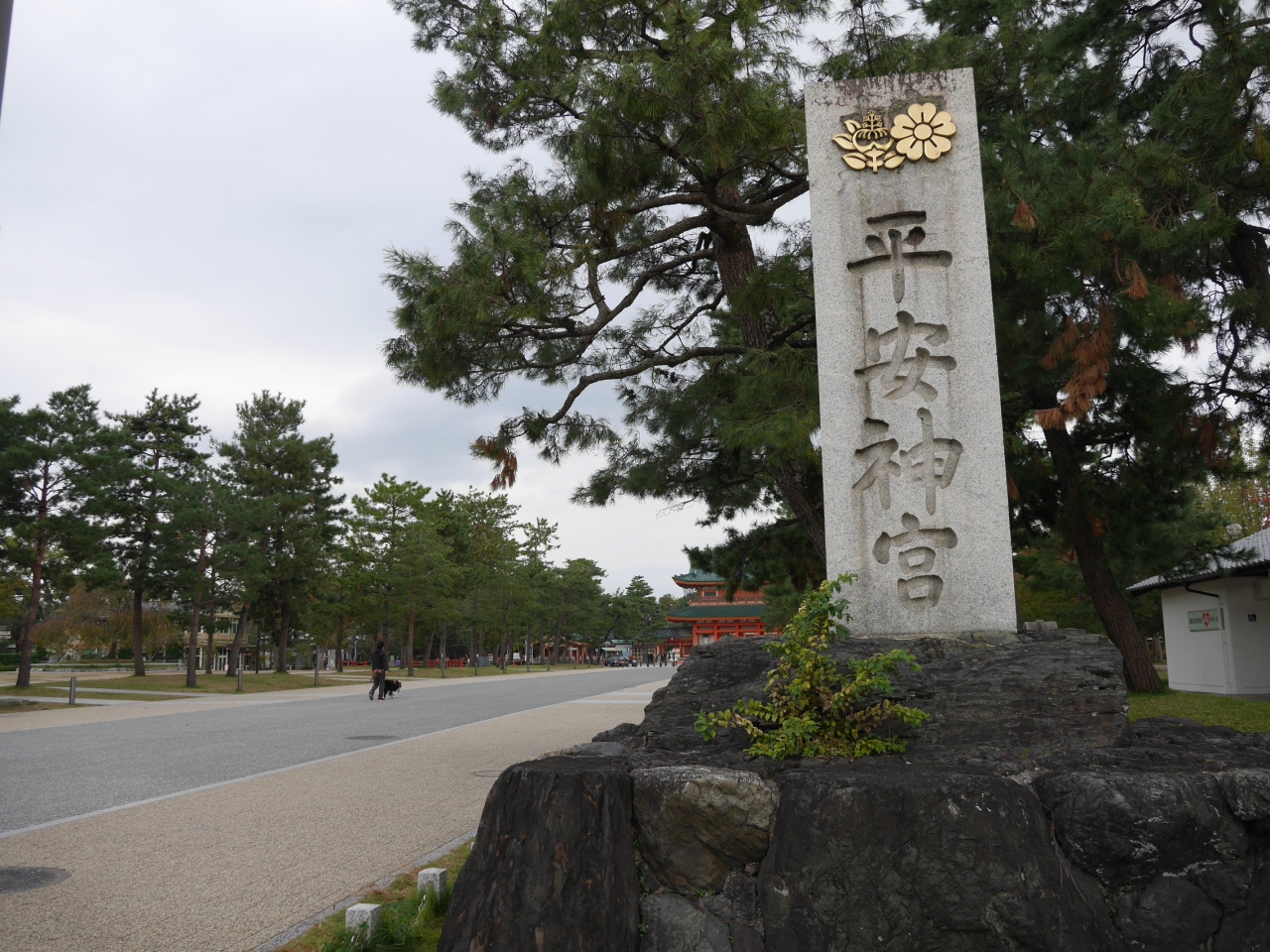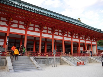 平安神宮で紅葉の時期は有料ですが裏手に広がる神苑を見るのが良いのですが時間も遅くなってしまいましたので神苑には入りませんでした。広い境内だけなら大きな桜の木が植えて有りますので桜の時期の方が良いと思います。大極殿は朝堂院の正殿を模造したものですが国の重要文化財に指定されており他にも見所は沢山ある神宮です。