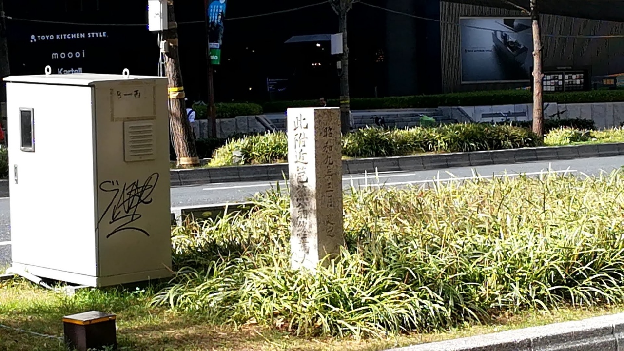 中央大通りと御堂筋が交わる本町交差点の少し南にありました。ただ、御堂筋の本道と側道の間の分離帯にあり、交通量も多いため近づくことは難しかったです。石碑の大きさもさほどでもなく、見つけるのに苦労しました。