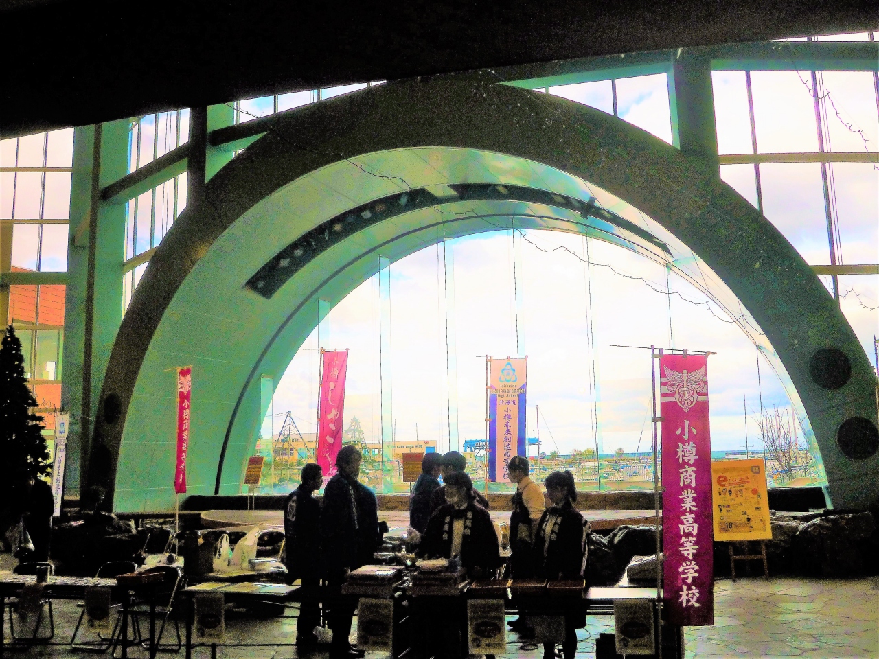 観光パスで昼食に`グランドパーク小樽`を利用しましたが、空き時間にホテルも入った大きなモールを散策しました、ホテル側モールにインフォメーションがありMs案内係に`モール全体を[ウイングベイ小樽]`でした。余裕ある空間とお店がのんびりと買い物できる様子が良いでした。アーチ型の窓から小樽湾/桟橋を見ましたが、そこに高校生が催し物売場を; 手作りの煎餅を一枚買って記念写真を!…小樽商業高校で聞けば`創設100余年`で、消費者とのやり取りを学んで,,流石、伝統ある高校で立派です(^^!)