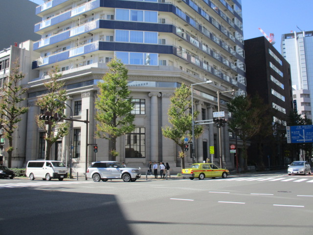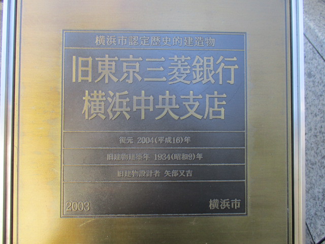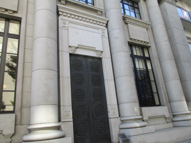 みなとみらい線馬車道駅出口7から日本大通り駅方面に進むと旧東京三菱銀行横浜中央支店(旧第百銀行横浜支店)に歩いて1分ぐらいで着きます。旧東京三菱銀行横浜中央支店は昭和9年(1934年)に横浜生まれの矢部又吉の設計で第百銀行横浜支店として建てられ、現在はファザード保存形式用い外壁に銀行時代の外観意匠を残し上層階は近代的な高層オフィスビルになってます。重厚感のある扉が見ごたえありますので横浜訪問の際には足を延ばしてお立ち寄りをお勧めします。歴史的建造物をファザード保存形式で復元維持することは素晴らしいと思います。