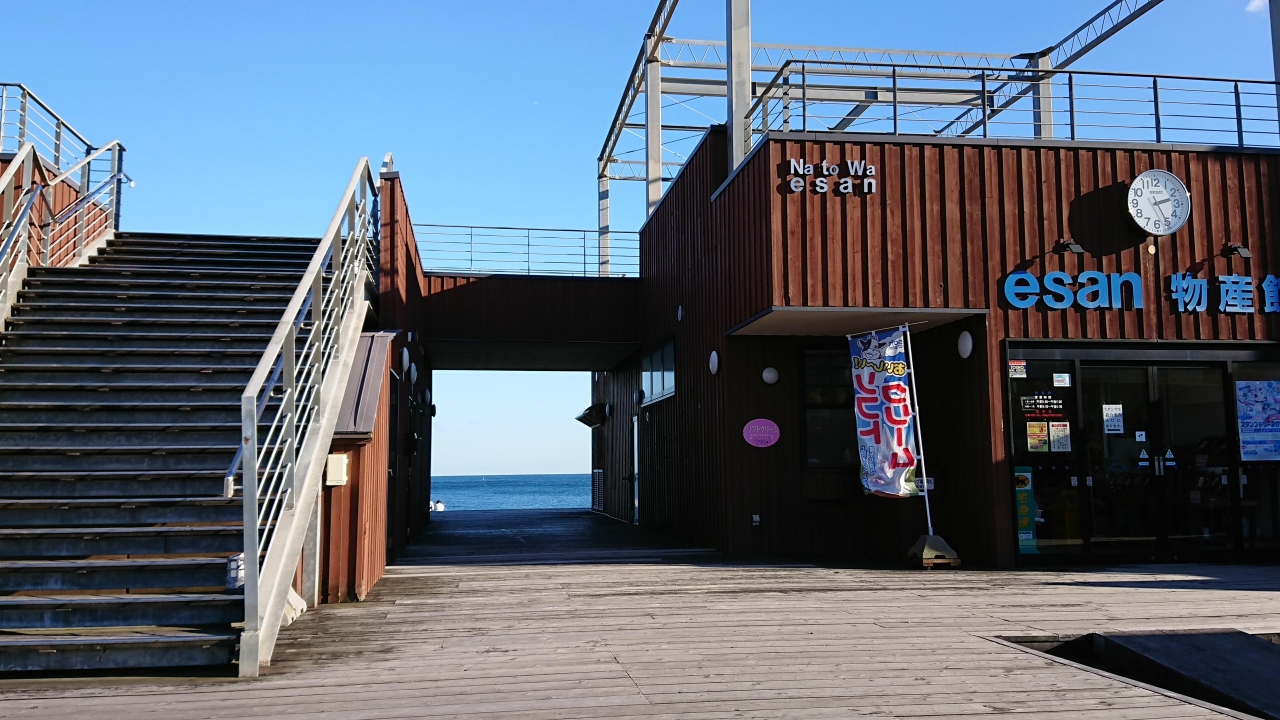 恵山海浜公園にあります。階段をのぼって2階に行くと、そこはちょっとした展望デッキです。海と恵山を眺められます。津軽半島も見えるそうです。1階は特産品の販売があります。昆布類が安く売られていたので、たくさん購入しました。