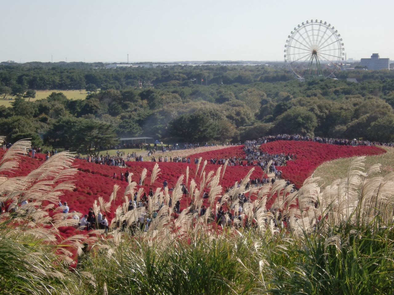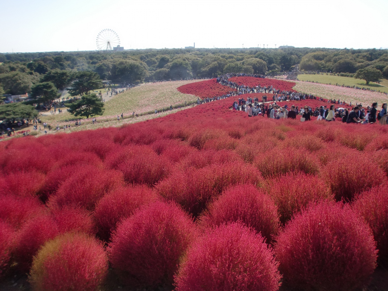 春はネモフィラの青いじゅうたんが広がるみはらしの丘も、秋はコキアの赤い球体がモフモコとお目見えします。