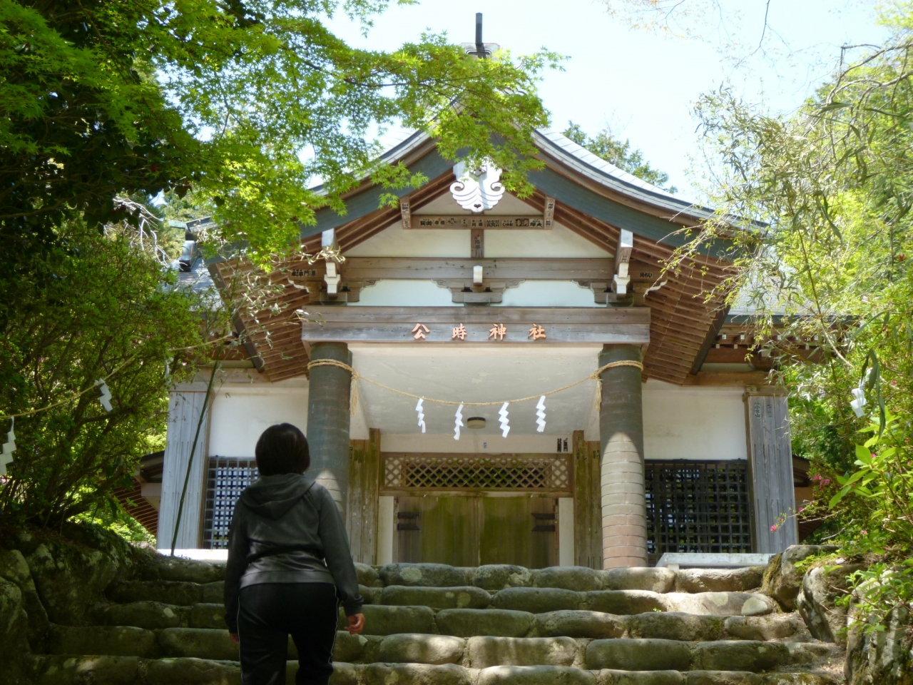 ゴルフ場に駐車して、金時山登山に行きました。登り始めてしばらくして、神社が見えます。登山前に安全を祈願する公時神社。ちょと開けた場所に石の階段を数段登り、歴史を感じる御社がある。公時神社の文字がやたらきれいで目立ちます。